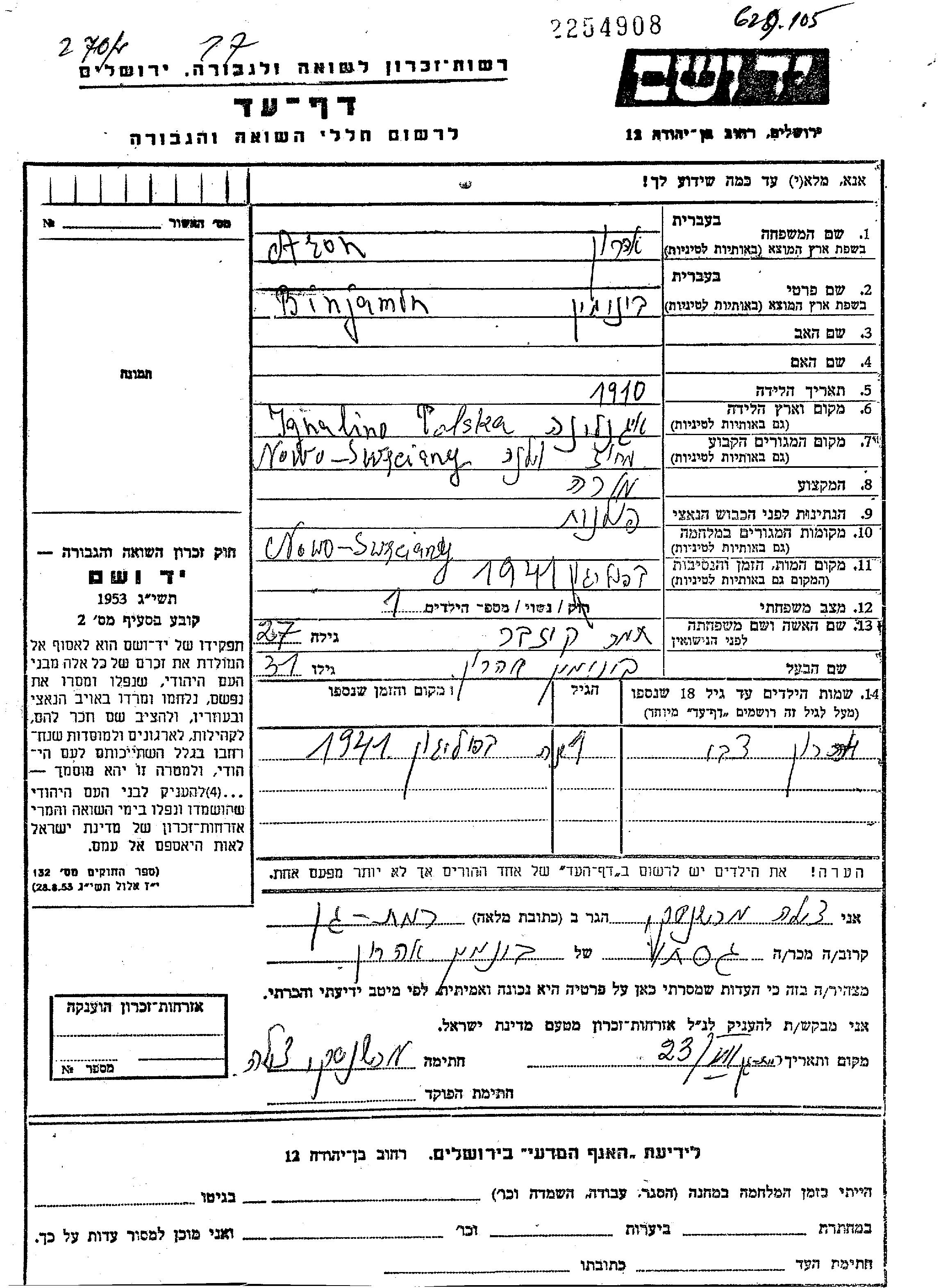 Beniamin Aron Aharon was born in Ignalina, Poland, 1910. He was a teacher. Prior to WWII he lived in Nowo Swieciany, Poland. Beniamin was murdered in the Shoah. Place of death: Nowe Swieciany, Poland, 1941.