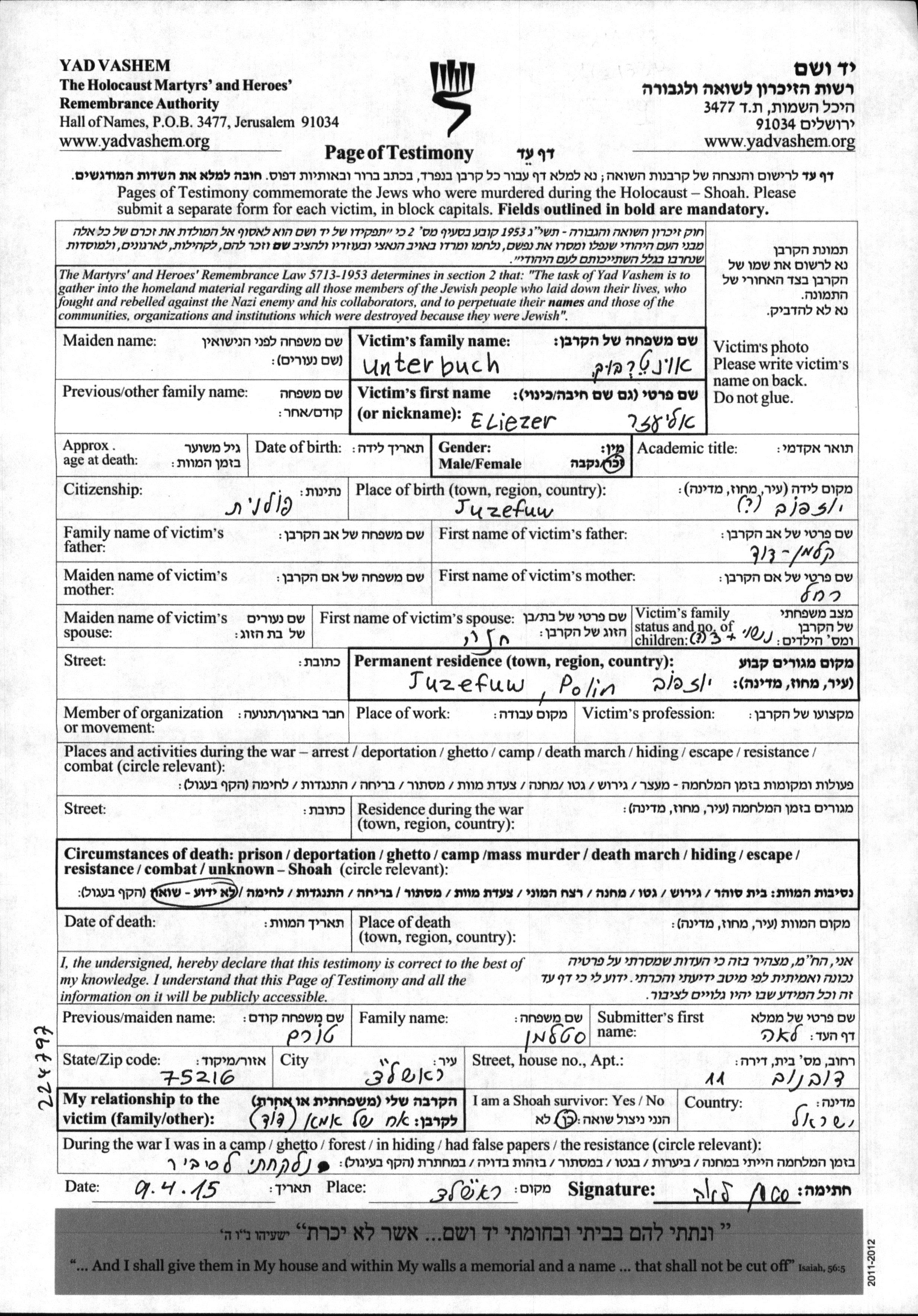 | Unterbuch | Eliezer | Jozefow, Poland | Page of Testimony | |