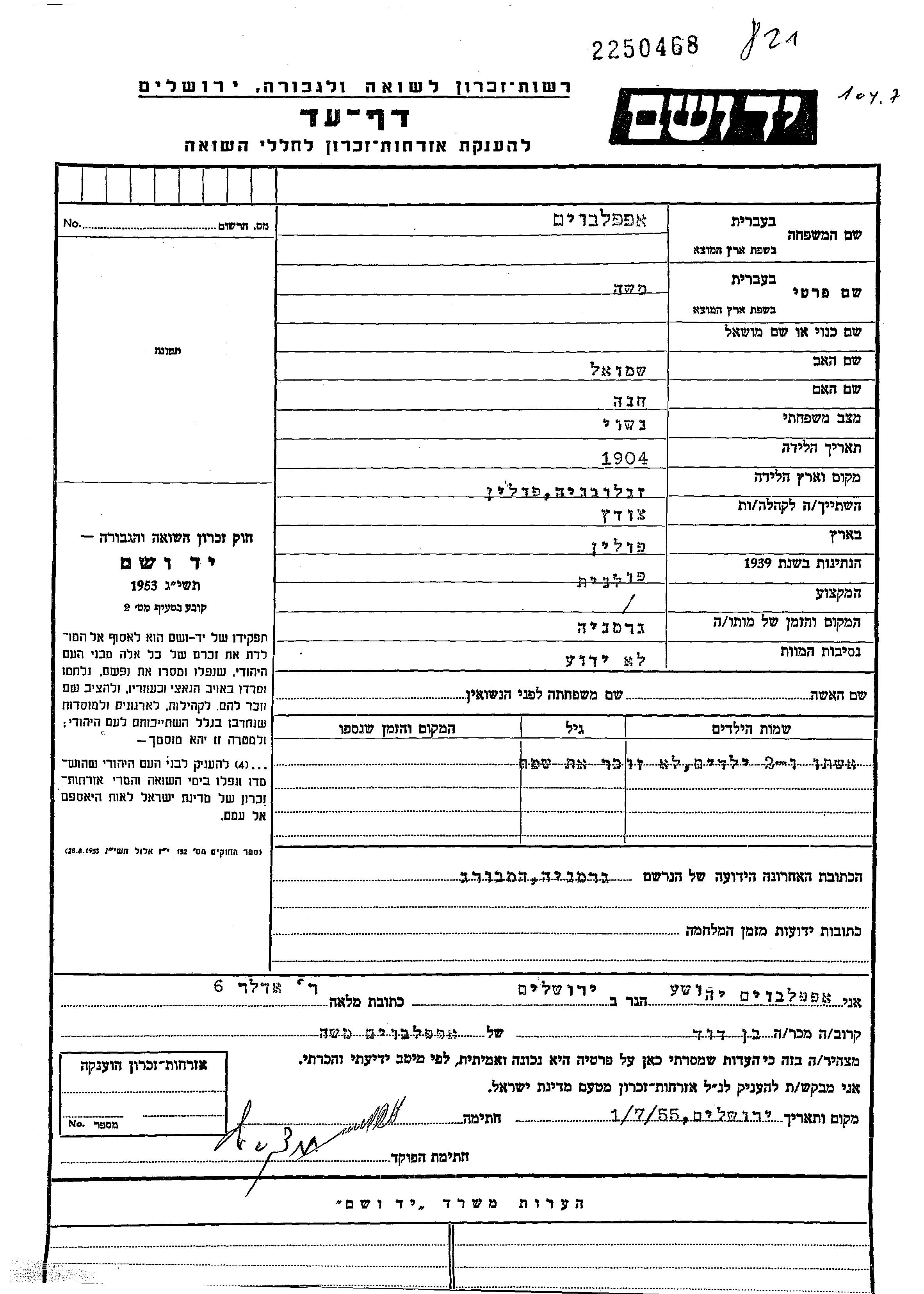 Moshe Appelboim was born in Zglobien, Poland, 1904 to Shmuel and Khana. He was married. Prior to WWII he lived in Czudec, Poland. During the war he was in Hamburg, Germany. Moshe was murdered in the Shoah.