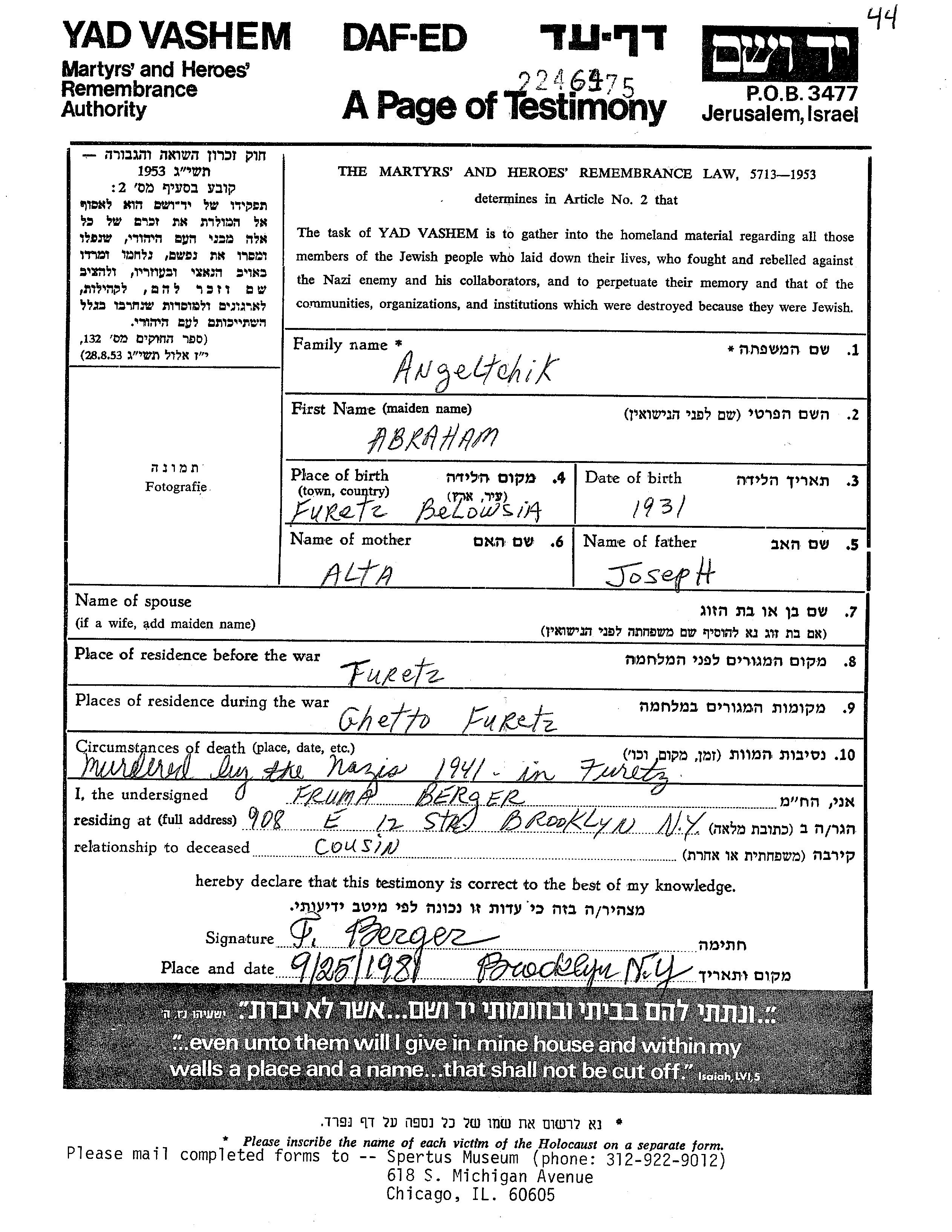 Abraham Angeltchik was born in Turetz, Poland, 1931 to Joseph and Alta nee Green. He was child. Prior to WWII he lived in Turetz, Poland. During the war he was in Turetz, Poland. Abraham was murdered in the Shoah. Place of death: Turetz, Poland, 1941.