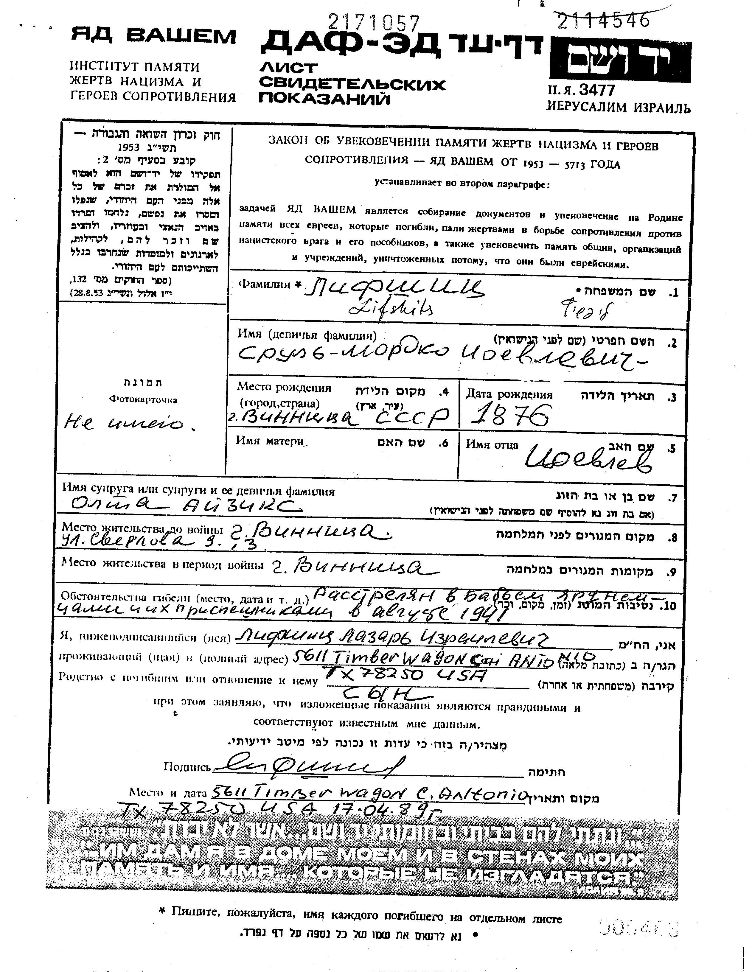 Lifshitz Yisrael Mordekhail Vinitza, Ukraine (USSR) Page of Testimony