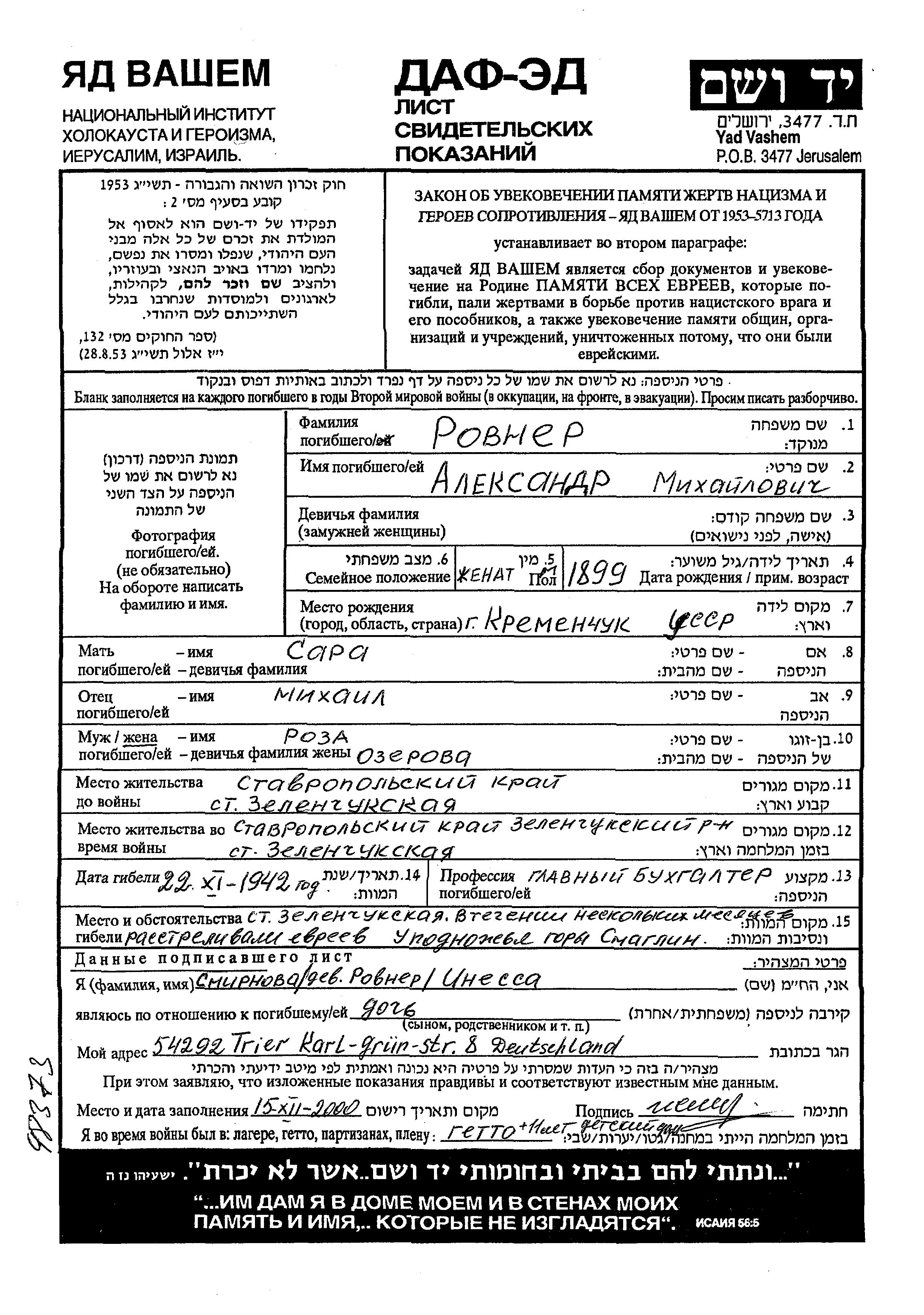Aleksandr Rovner was born in Kremenchug, Ukraine (USSR), 1899. He was a chief accountant. Prior to WWII he lived in Zelenchukskaya, Russia (USSR). Aleksandr was murdered in the Shoah. Place of death: Zelenchukskaya, Russia (USSR), 1942.