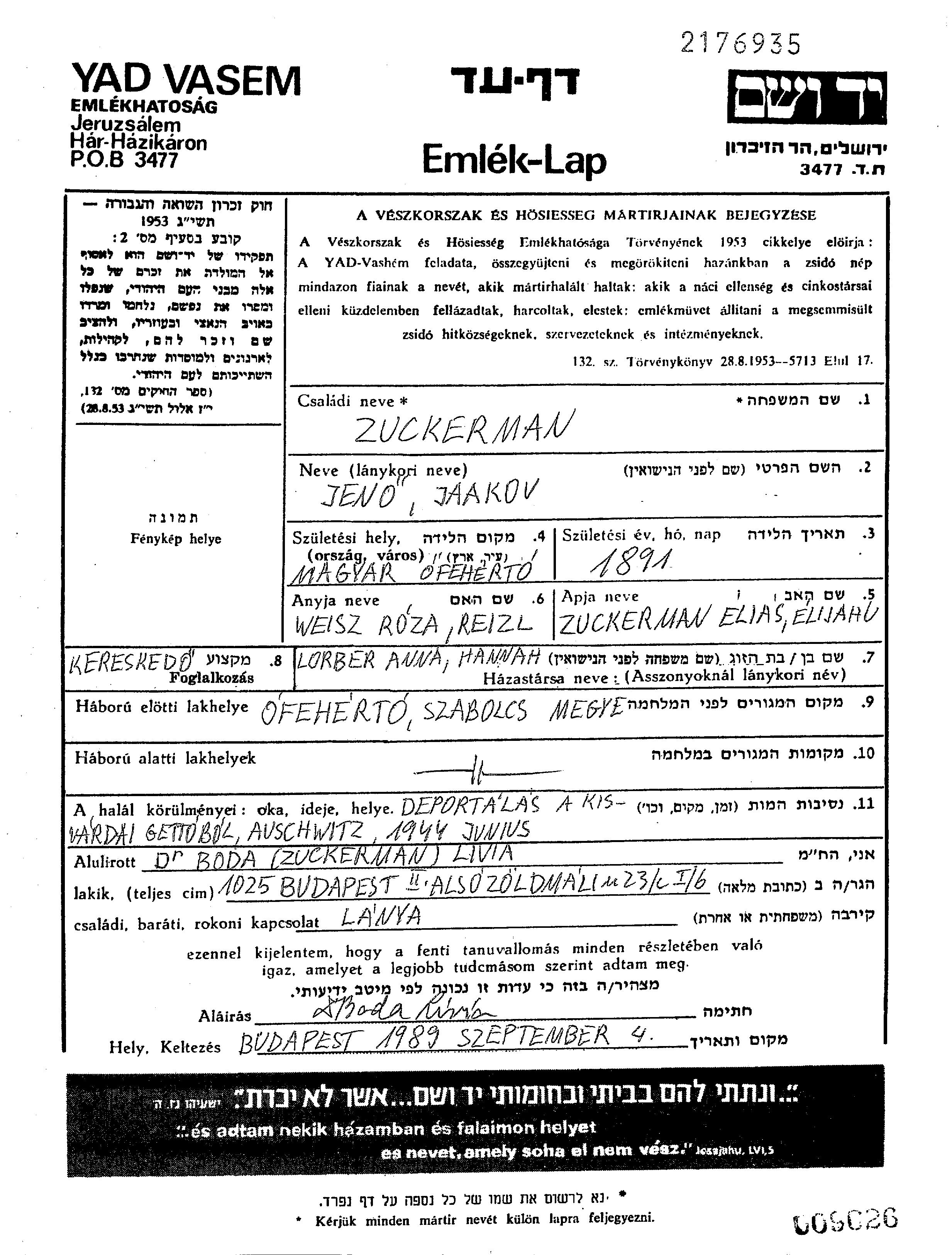 Zuckerman | Jeno Jaakov | 1891 | Ofeherto, Hungary | Page of Testimony |