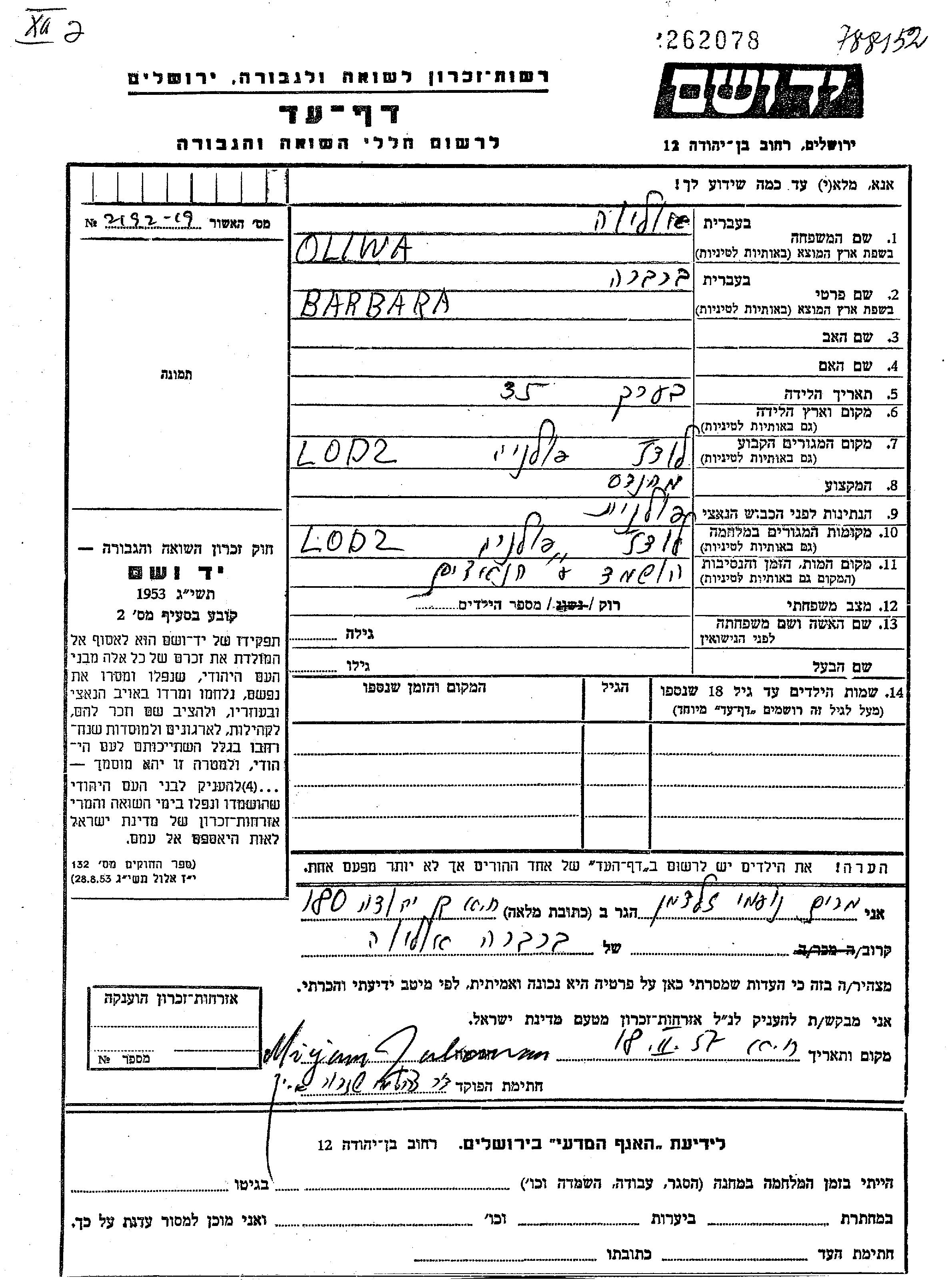 Oliwa Barbara Lodz, Poland Page of Testimony