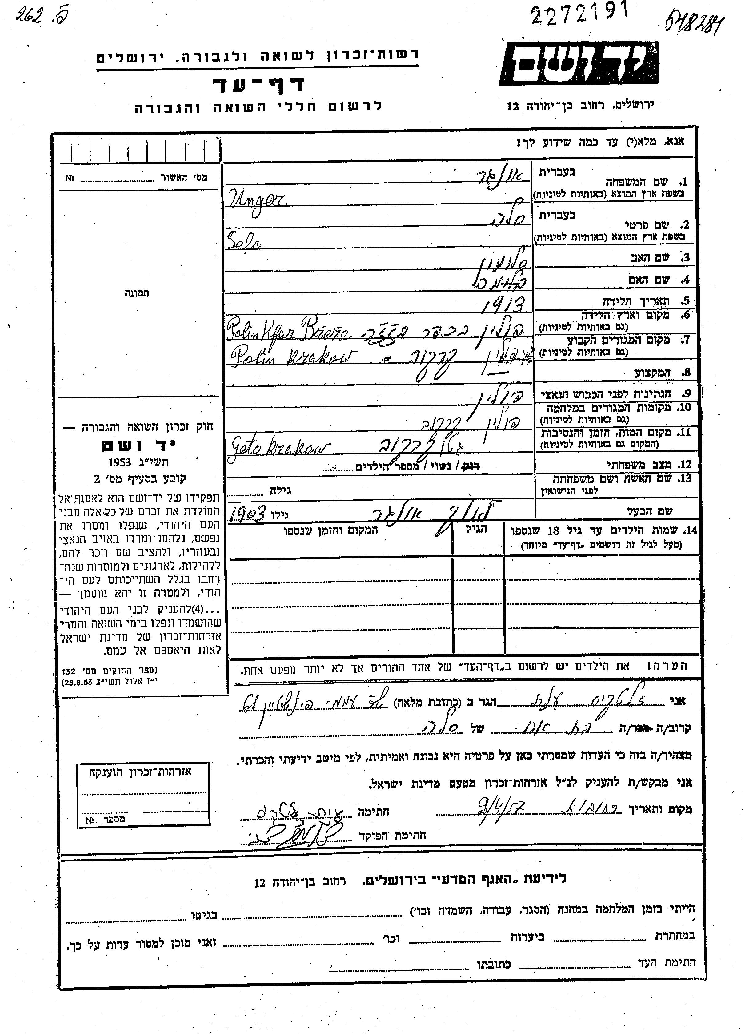 Unger Sala 1913 Krakow, Poland Page of Testimony