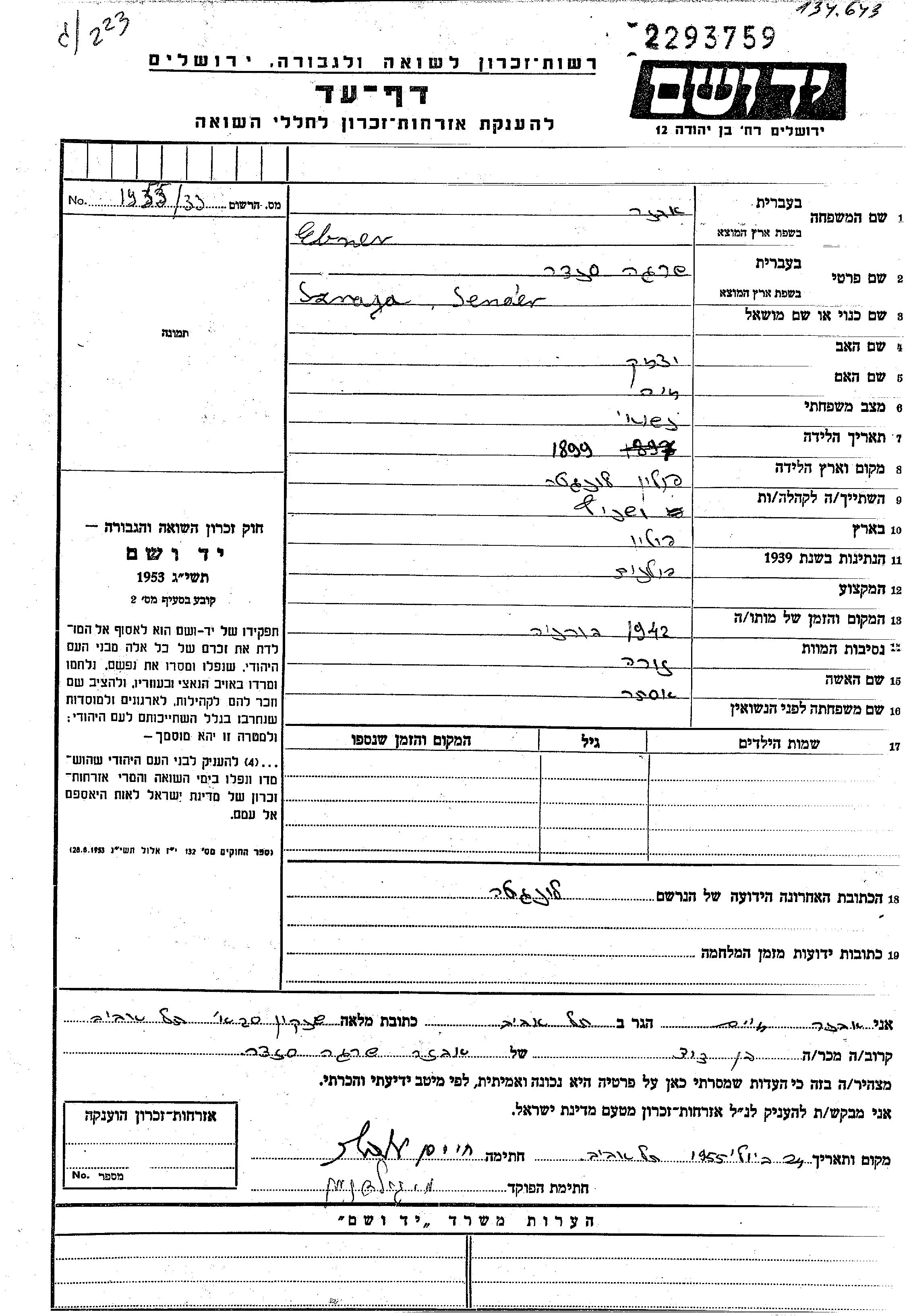 Szraga Sender Avner was born in Lakta, Poland, 1899 to Ytzkhak and Khaia. He was married to Ester. Prior to WWII he lived in Wisnicz, Poland. During the war he was in Lakta, Poland. Szraga Sender was murdered in the Shoah. Place of death: Bochnia, Poland, 1942.
