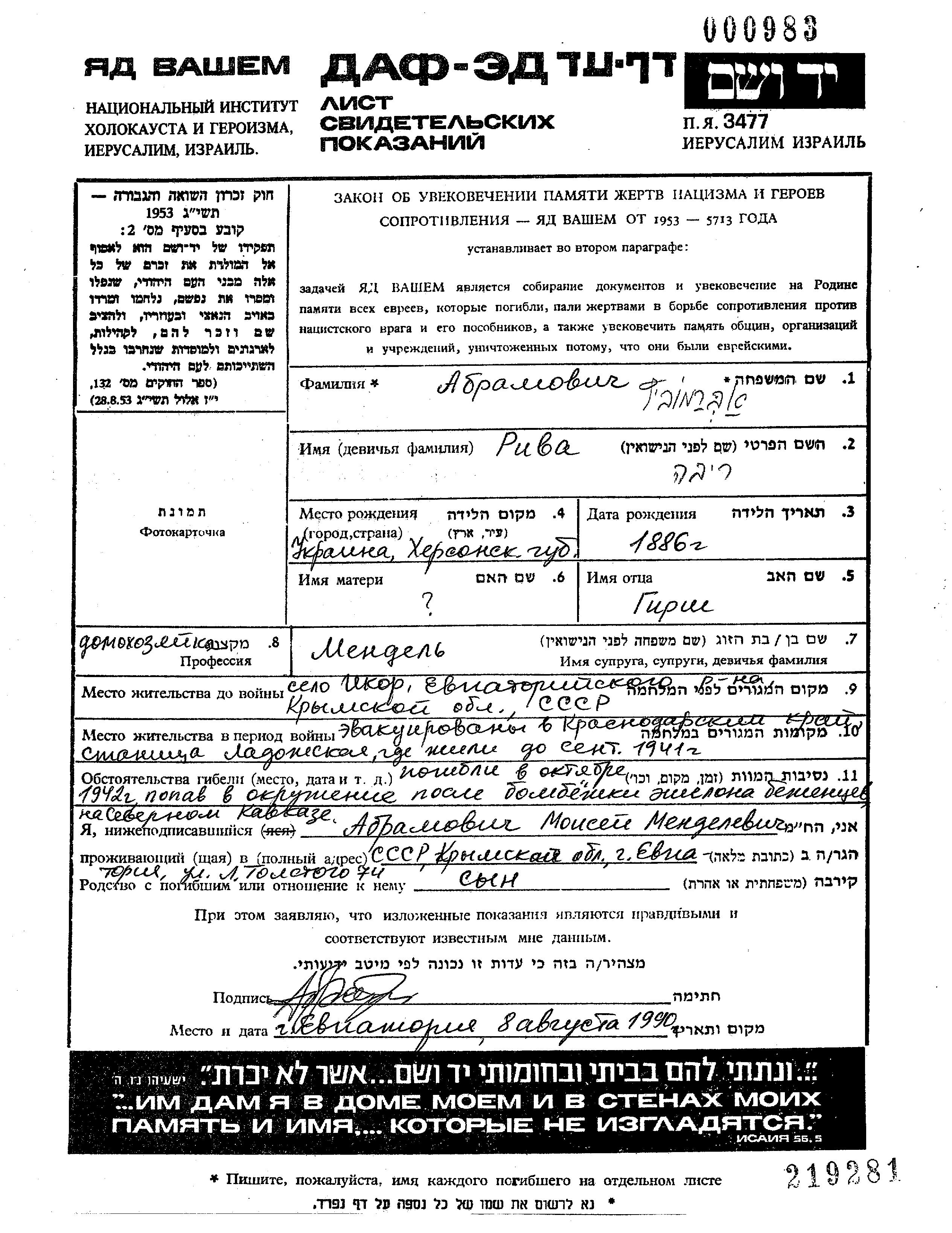 Abramovich Riva 1886 Ikor, Russia (USSR) Page of Testimony
