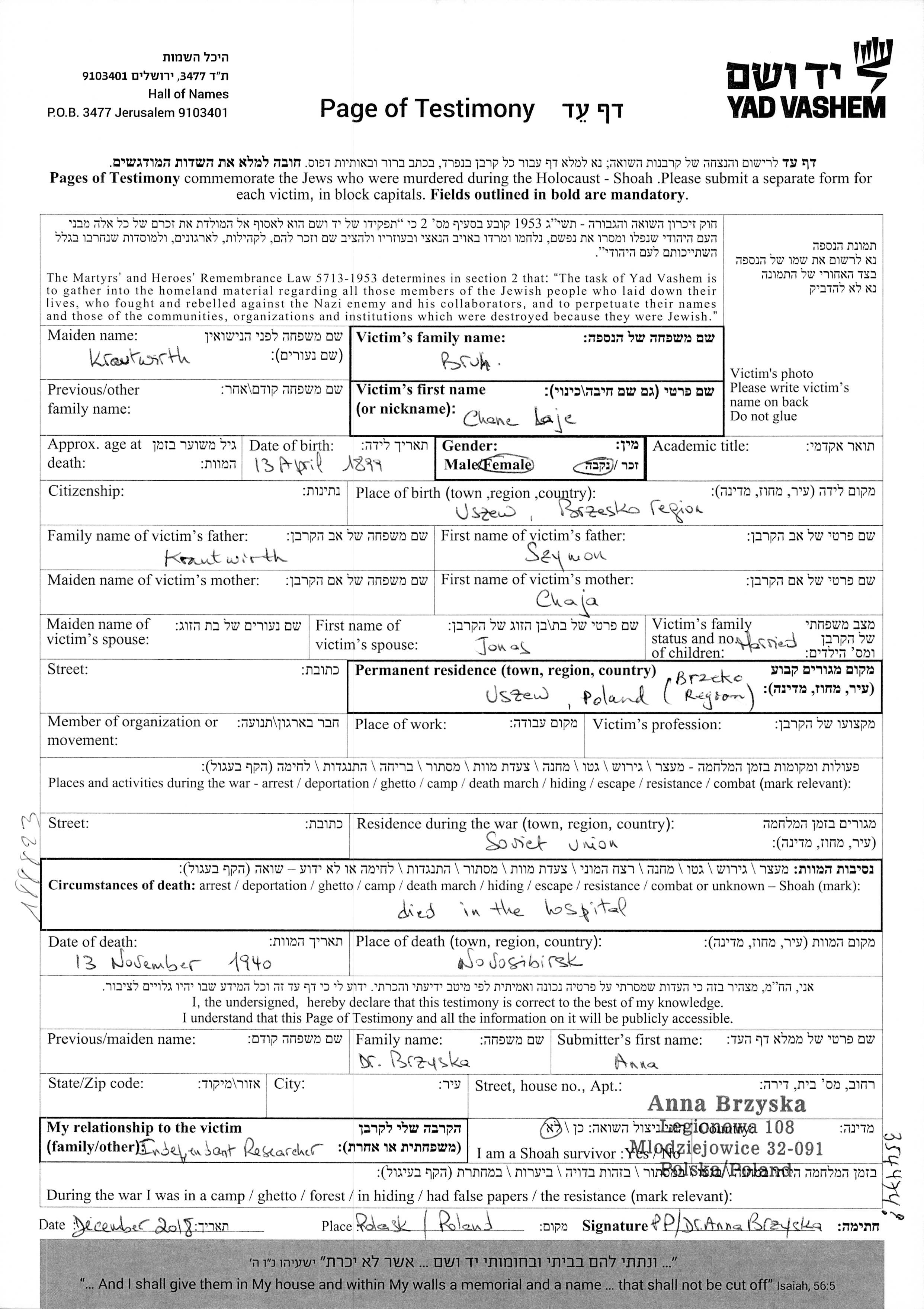 Chane Laje Bruh nee Krautwirth was born in Uszew, Poland, 1899 to Szymon and Chaja. She was married to Jonas. Prior to WWII she lived in Uszew, Poland. During the war she was in Undeciphered Place, USSR. Chane Laje perished during the period 1933-1945 in indirect relation with the Shoah. Place of death: Novosibirsk, Russia (USSR), 13/11/1940.