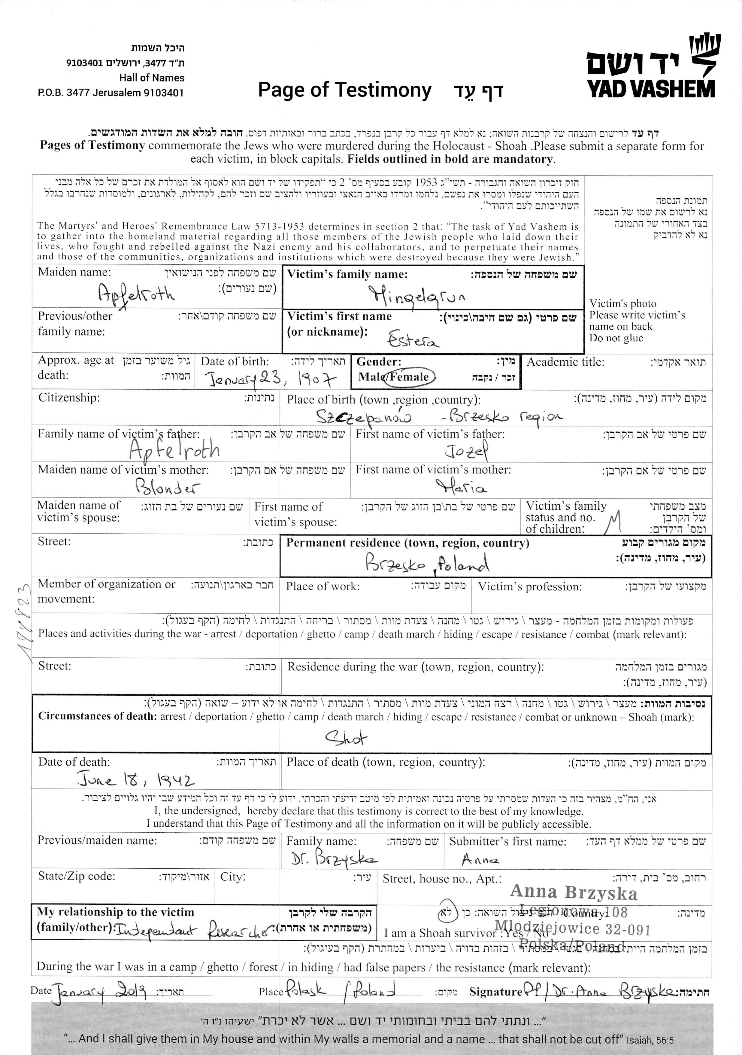 Estera Mingelgrun nee Apfelroth was born in Szczepanow, Poland, 1907 to Jozef and Maria nee Blonder. She was married. Prior to WWII she lived in Brzesko, Poland. Estera was murdered in the Shoah. Place of death: unknown, 18/06/1942.