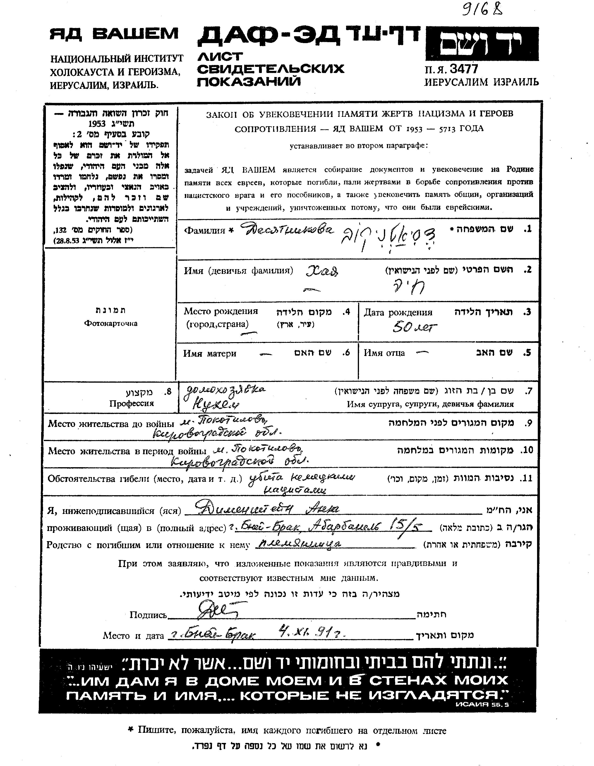 Khaia Desyatnikov. She was a housewife and married to Nukhem. Prior to WWII she lived in Pokotilovo, Ukraine (USSR). During the war she was in Pokotilovo, Ukraine (USSR). Khaia was murdered in the Shoah.