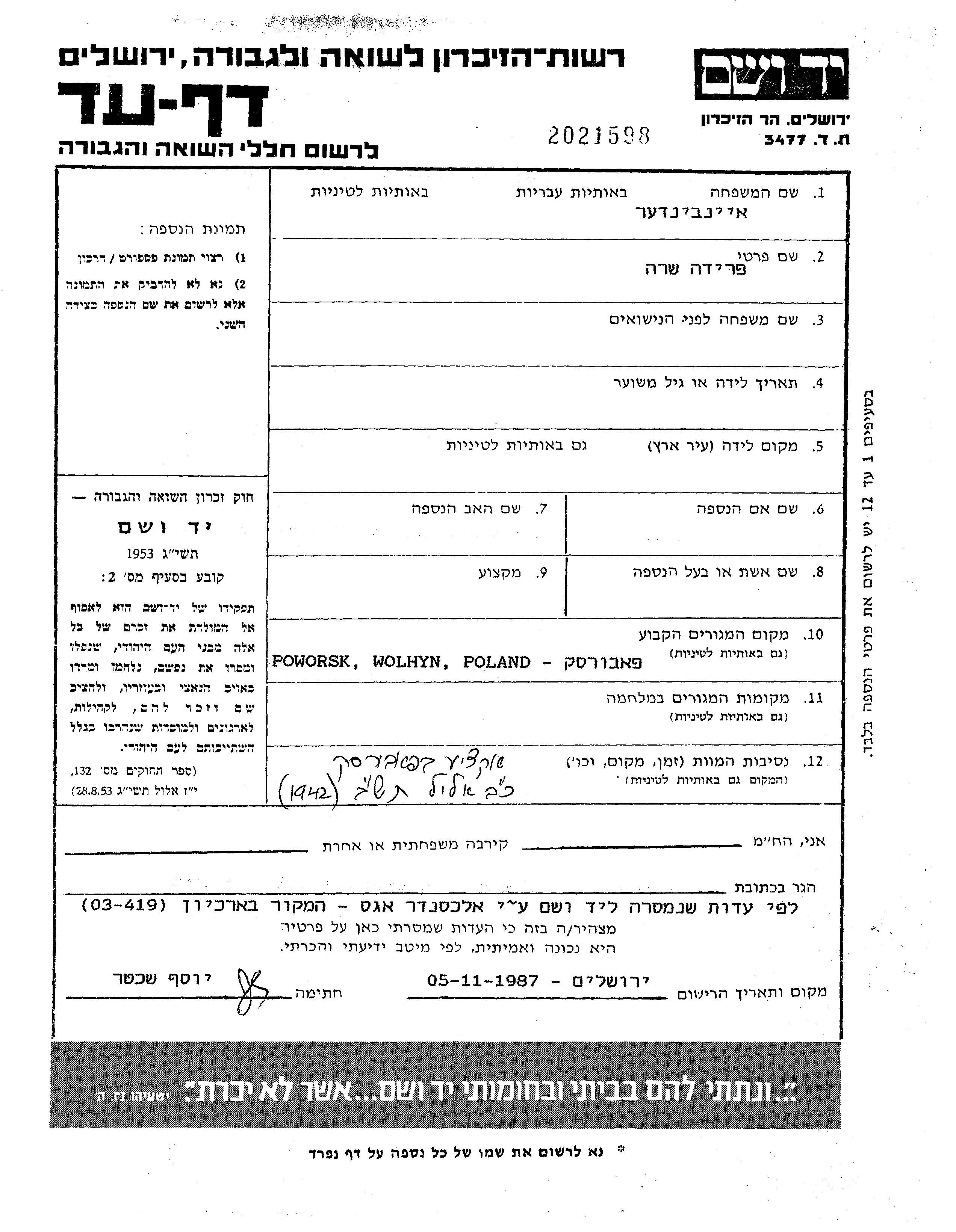 Ainbinder Frida Sara Poworsk, Poland Page of Testimony