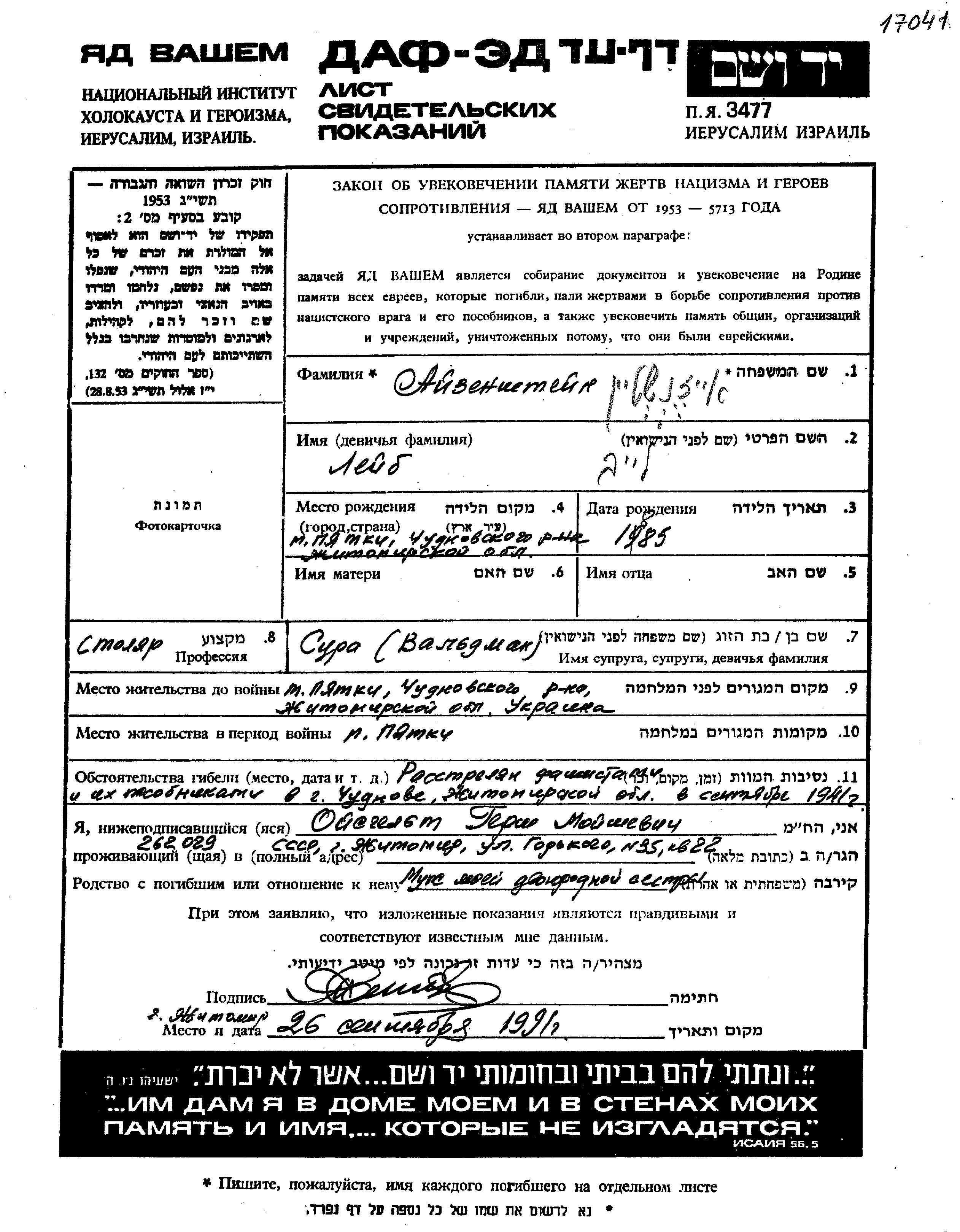 Leib Aizenshtein was born in Pyatka, Ukraine (USSR). He was a carpenter. Prior to WWII he lived in Pyatka, Ukraine (USSR). Leib was murdered in the Shoah. Place of death: Pyatka, Ukraine (USSR), 24/09/1941.