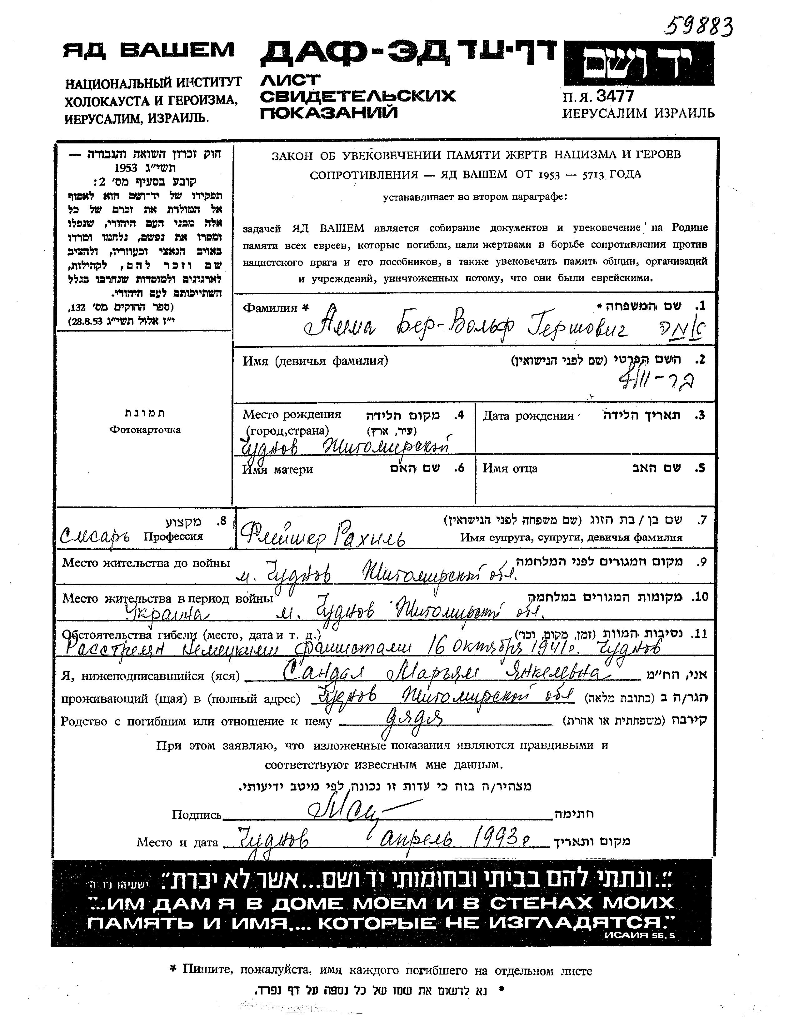 Beryu Volf Amma was born in Chudnov, Ukraine (USSR), 1901. He was a metalworker. Prior to WWII he lived in Chudnov, Ukraine (USSR). Beryu Volf was murdered in the Shoah. Place of death: Chudnov, Ukraine (USSR), 16/10/1941.