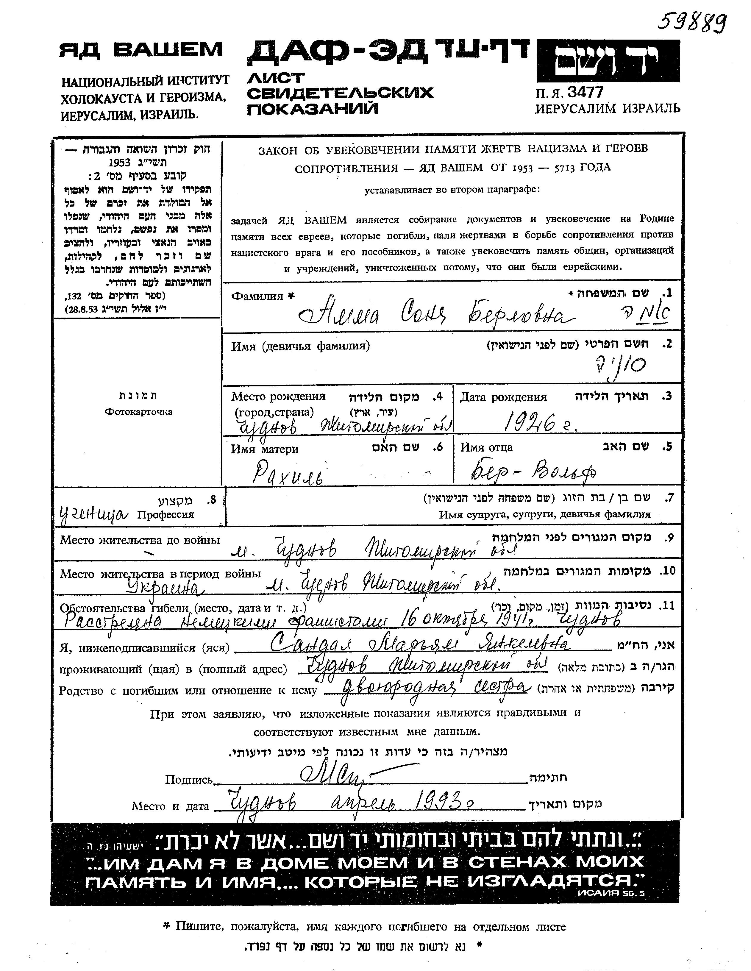 Sonia Amma was born in Chudnov, Ukraine (USSR), 1926. She was a pupil. Prior to WWII she lived in Chudnov, Ukraine (USSR). Sonia was murdered in the Shoah. Place of death: Chudnov, Ukraine (USSR), 16/10/1941.