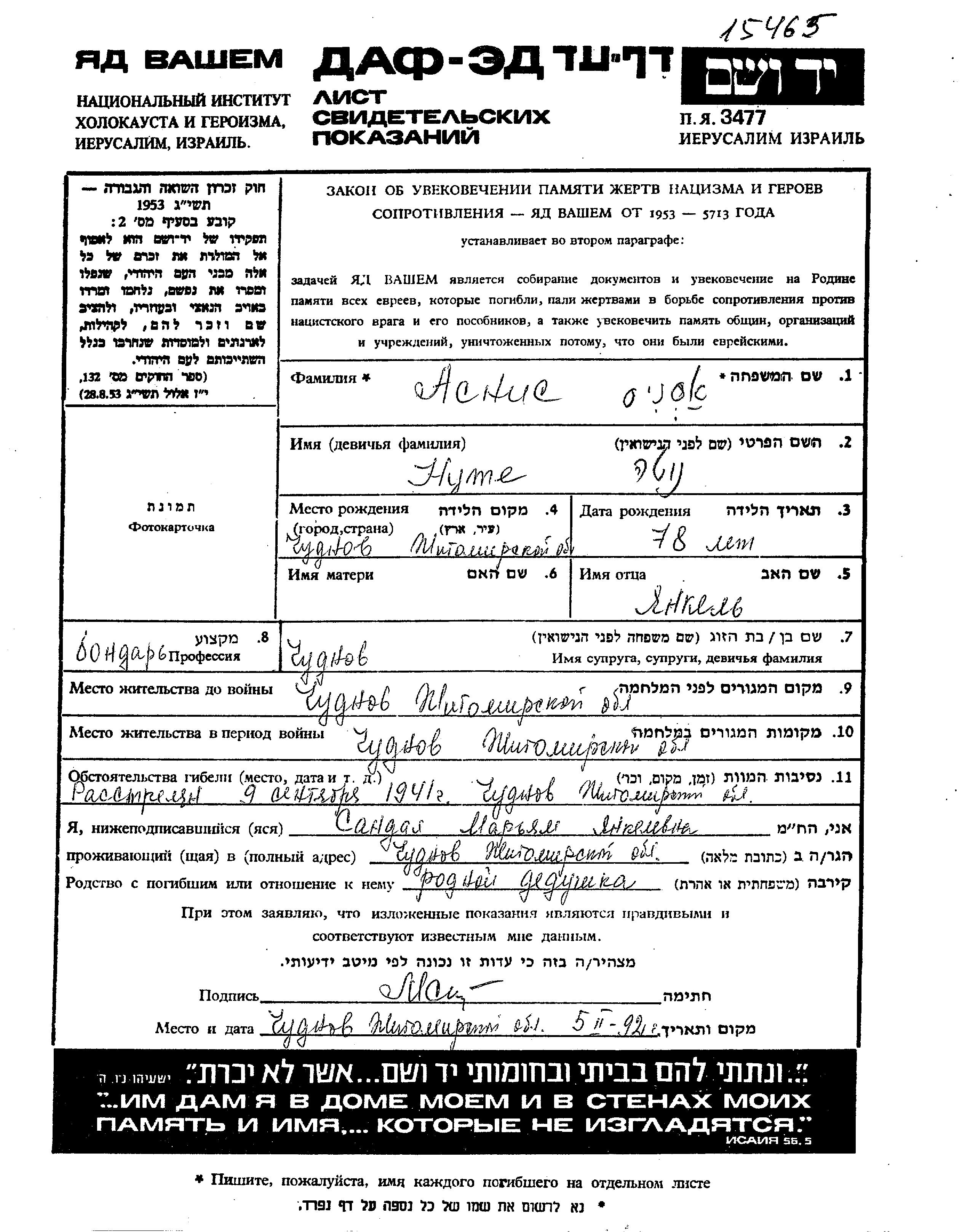 Nuta Asnis was born in Chudnov, Ukraine (USSR), 1871. He was a craftsman. Prior to WWII he lived in Chudnov, Ukraine (USSR). Nuta was murdered in the Shoah. Place of death: Chudnov, Ukraine (USSR), 1941.