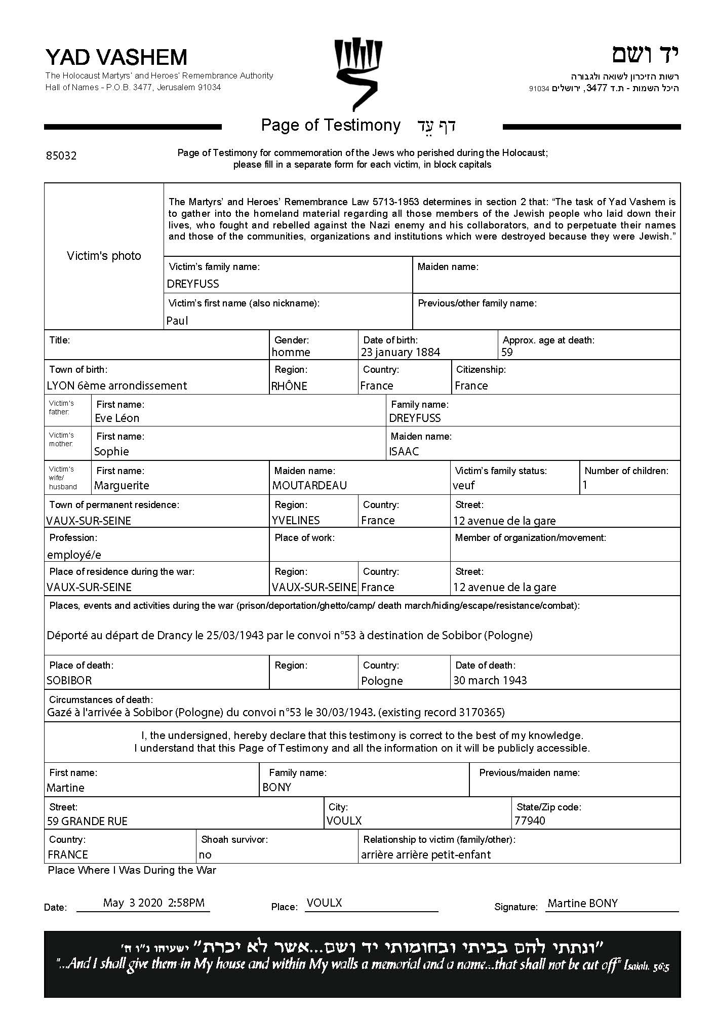 Dreyfuss Paul 1884 Vaux-sur-Seine, France Page of Testimony