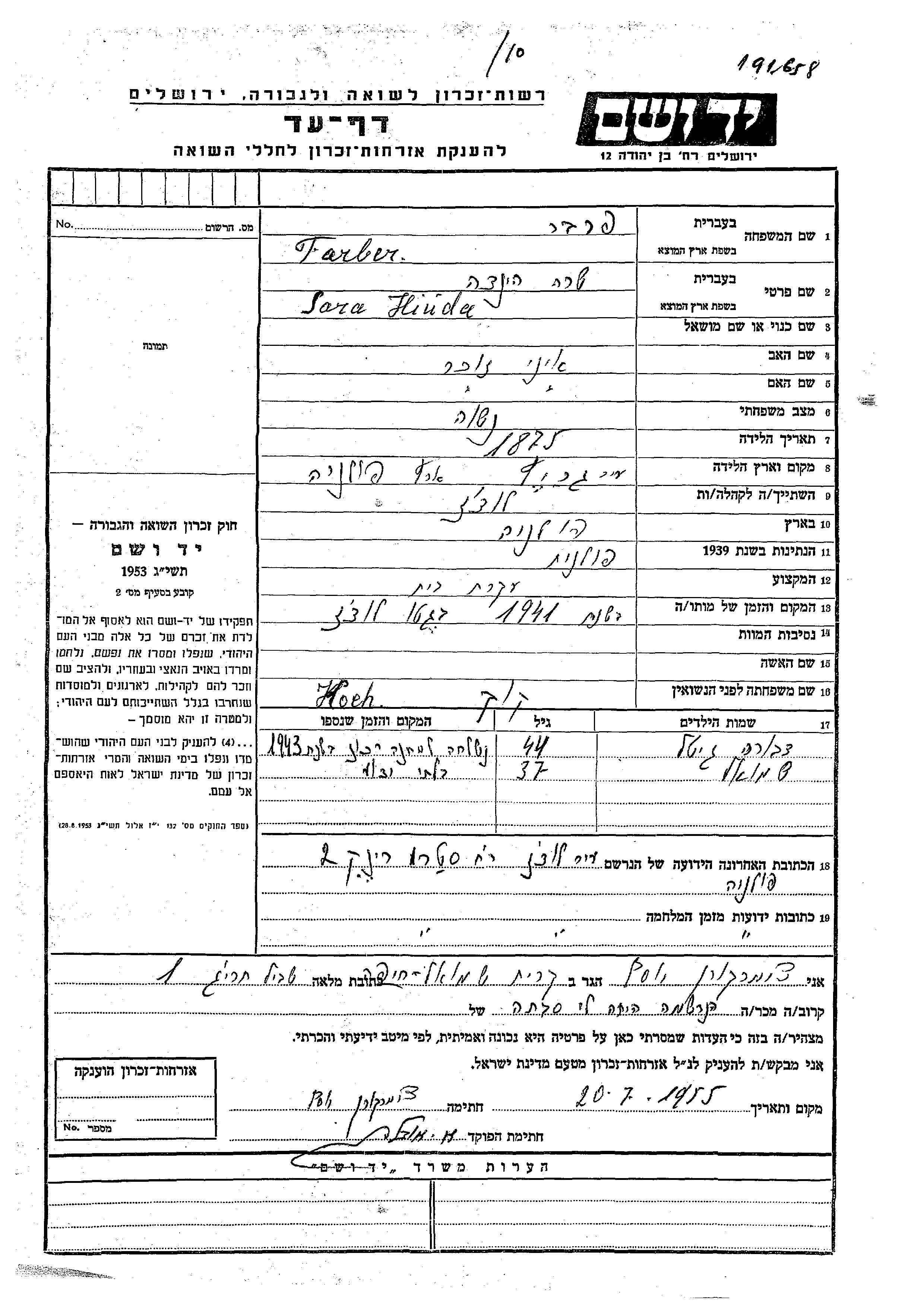 Sara Hinda Farber nee Koch was born in Grojec, Poland, 1875. She was a housewife. Prior to WWII she lived in Łódź, Poland. Sara Hinda was murdered in the Shoah. Place of death: Poland.