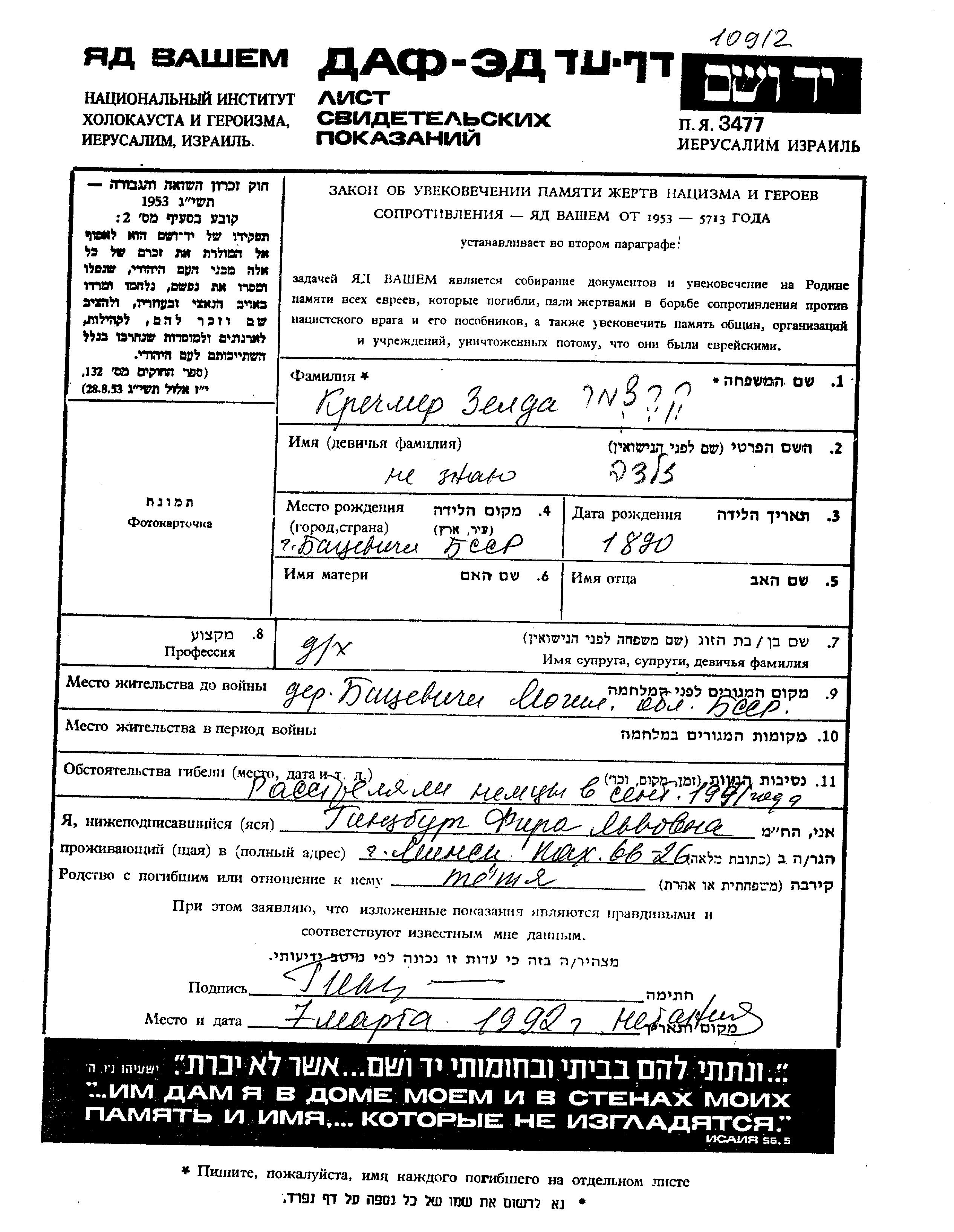 Zelda Krechmer was born in Batsevichi, Belorussia (USSR), 1890. She was a housewife. Prior to WWII she lived in Batsevichi, Belorussia (USSR). Zelda was murdered in the Shoah. Place of death: Batsevichi, Belorussia (USSR), 16/10/1941.