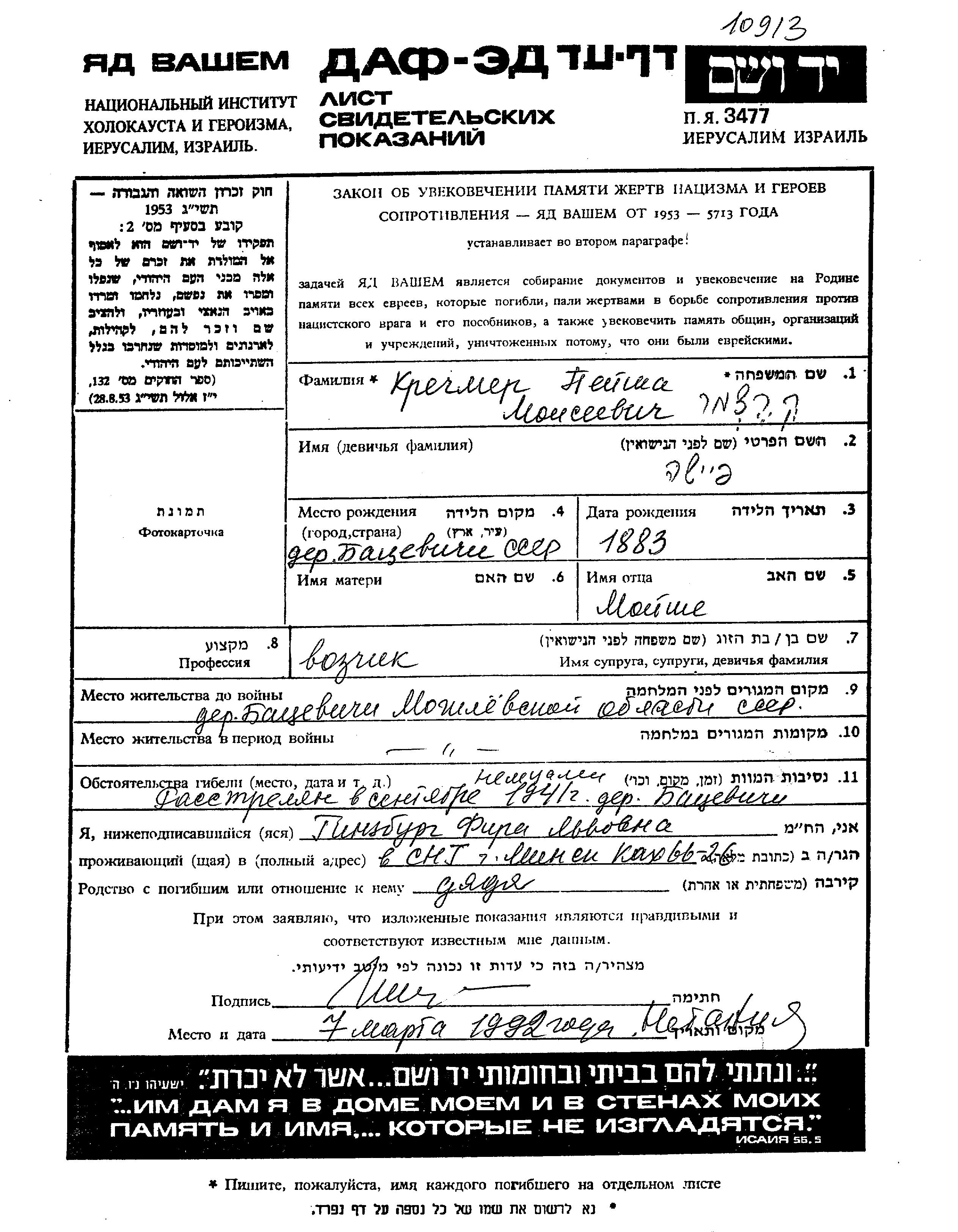 Peisha Krechmer was born in Batsevichi, Belorussia (USSR), 1883. He was a waggoner. Prior to WWII he lived in Batsevichi, Belorussia (USSR). Peisha was murdered in the Shoah. Place of death: Batsevichi, Belorussia (USSR), 09/1941.