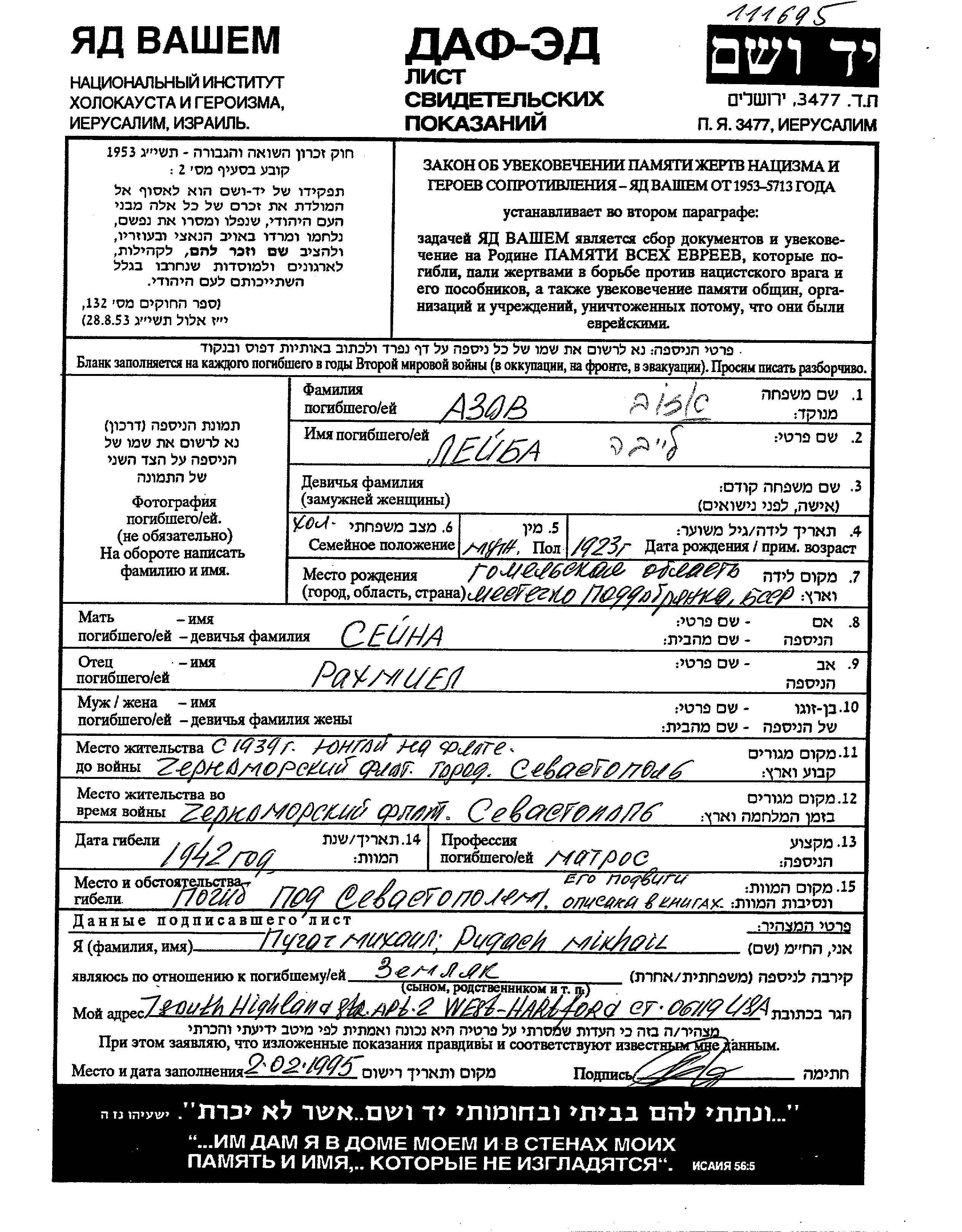 Azov Leiba Leonid 1923 Sevastopol, Russia (USSR) Page of Testimony
