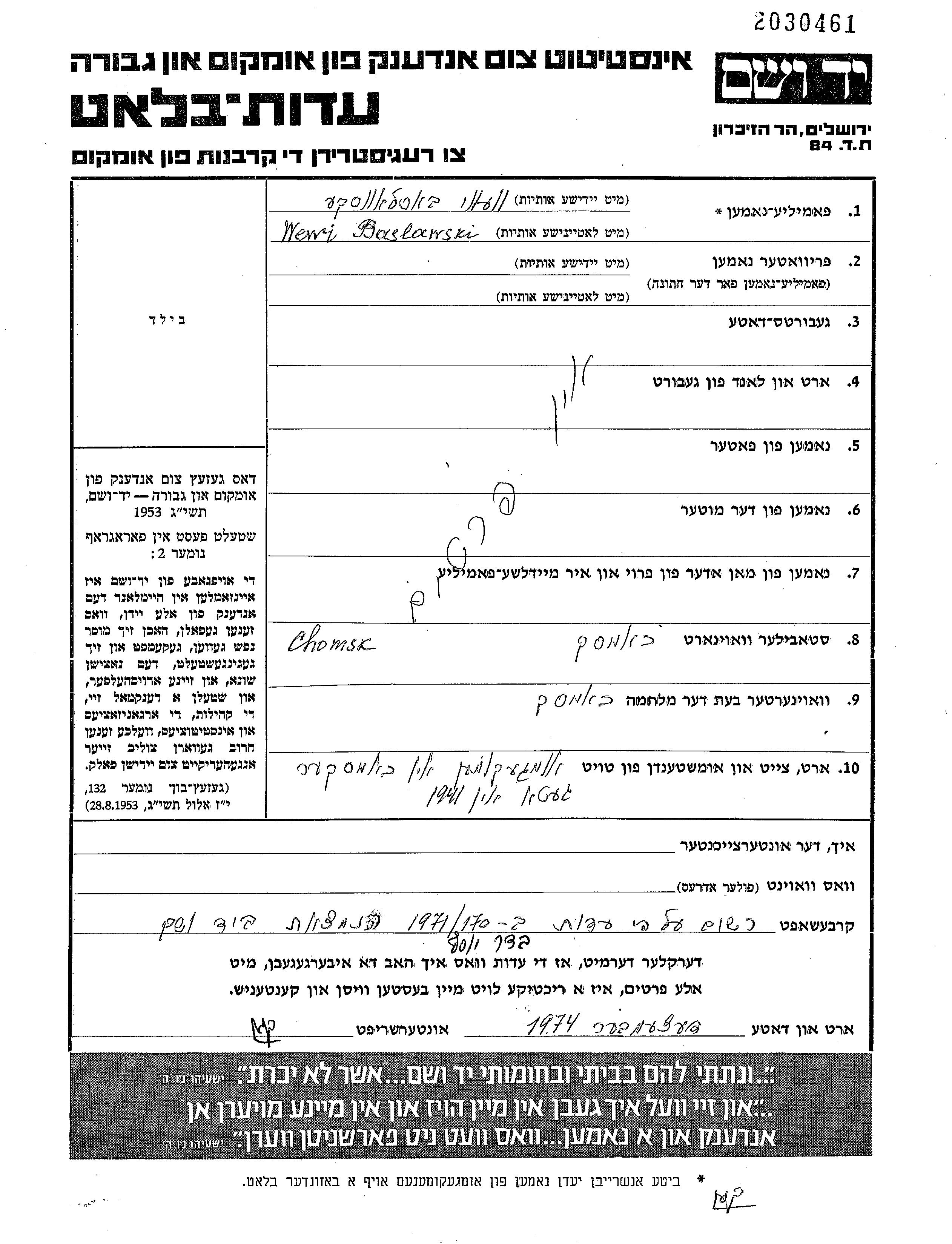 Baslawski Wewi Chomsk, Poland Page of Testimony