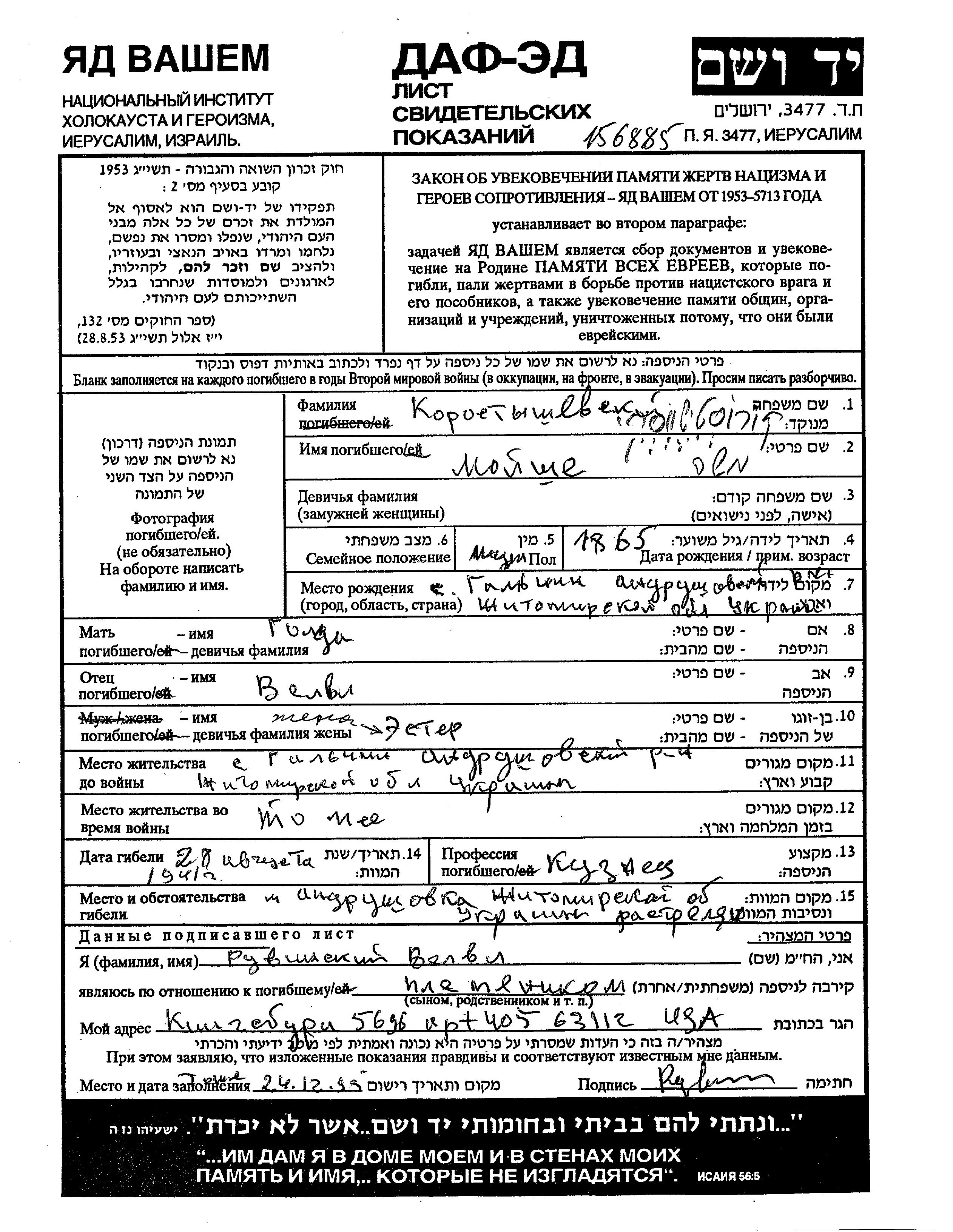Korostyshevski Moisei Andrushevka, Ukraine (USSR) Page of Testimony