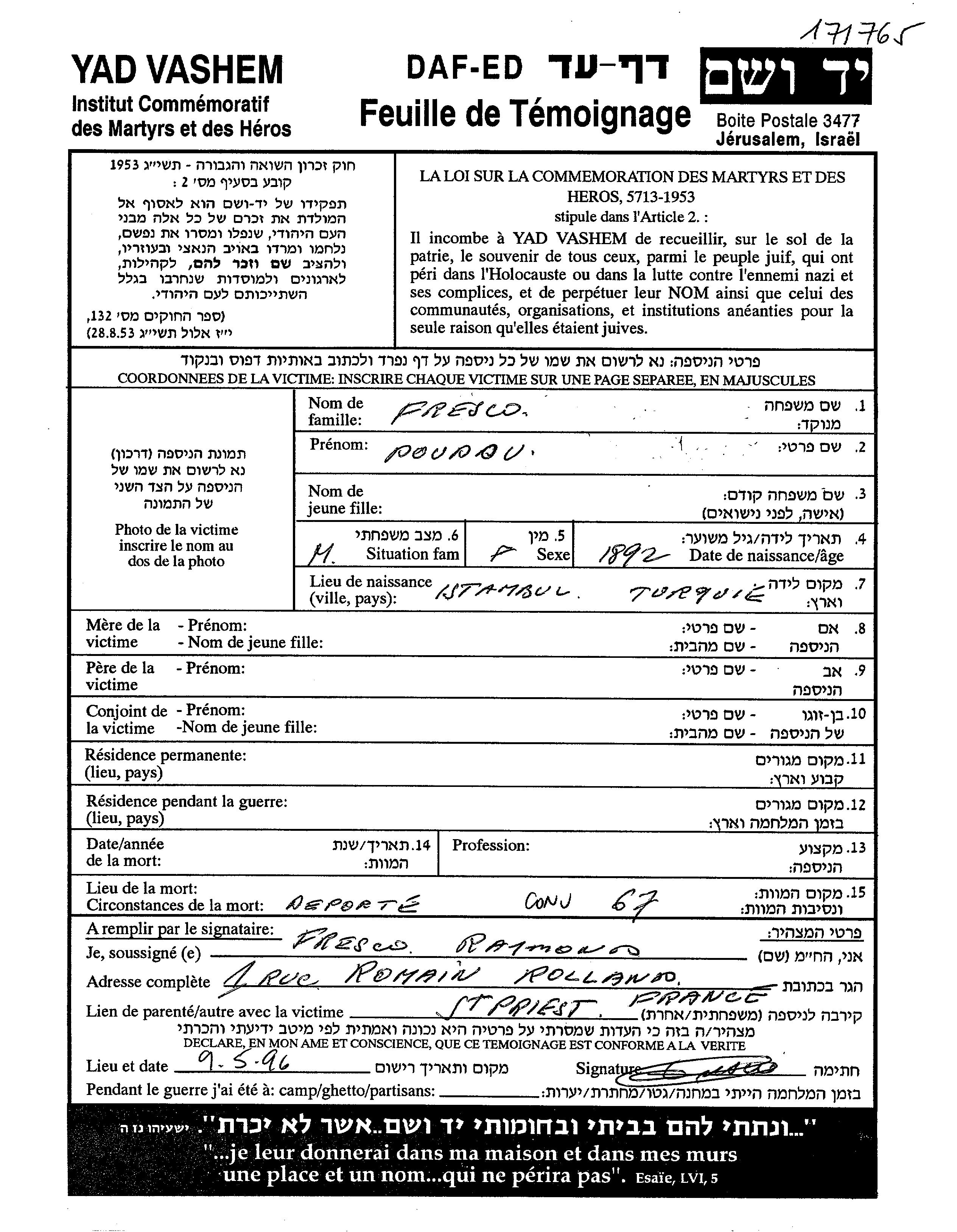 Yad Vashem - Pages of Testimony Names Memorial Collection
