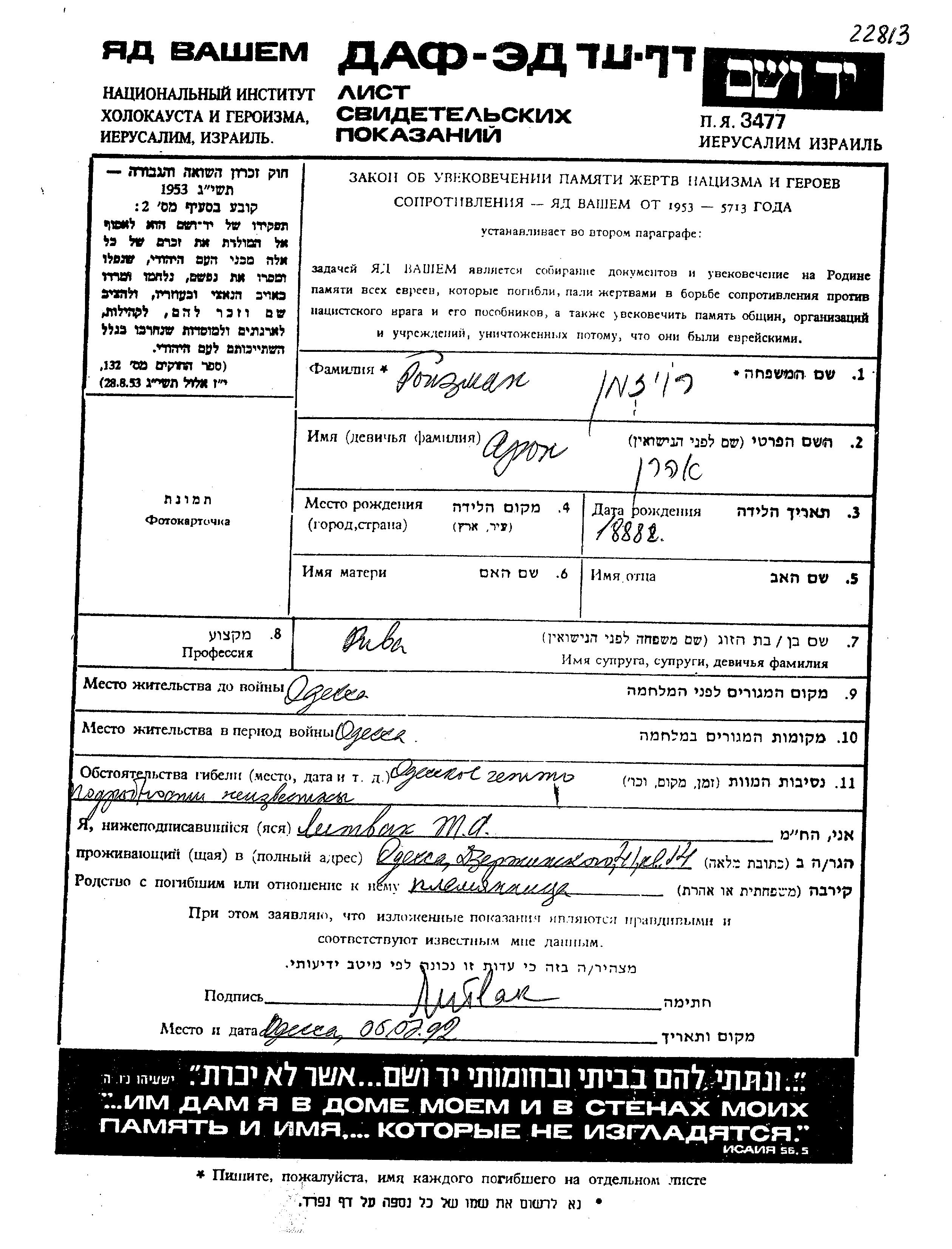 Roizman | Aron | 1888 | Odessa, Ukraine (USSR) | Page of Testimony |
