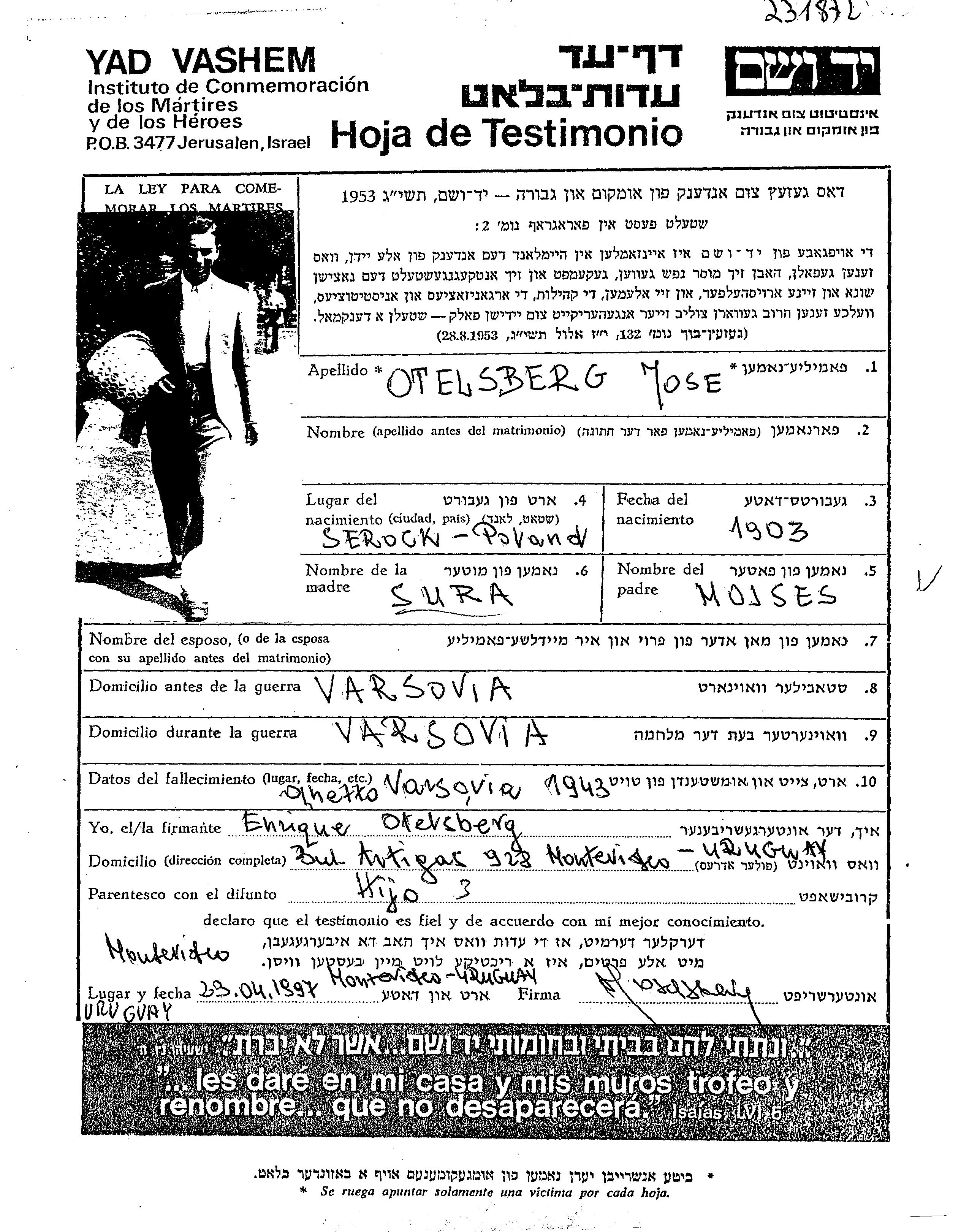 | Otelsberg | José | 1905 | Warszawa, Poland | Page of Testimony |