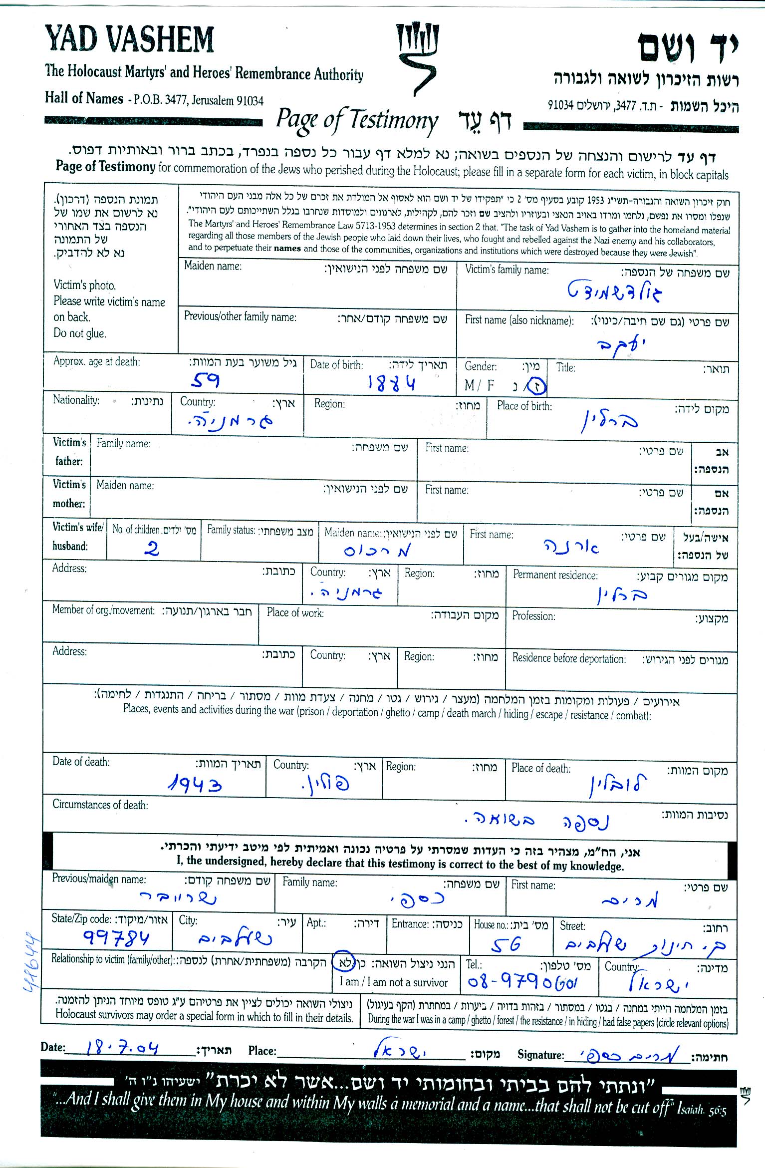Yaakov Goldschmidt was born in Berlin, Germany, 1884. He was an agent. Prior to WWII he lived in Berlin, Germany. Yaakov was murdered in the Shoah. Place of death: Lublin, Poland, 1943.