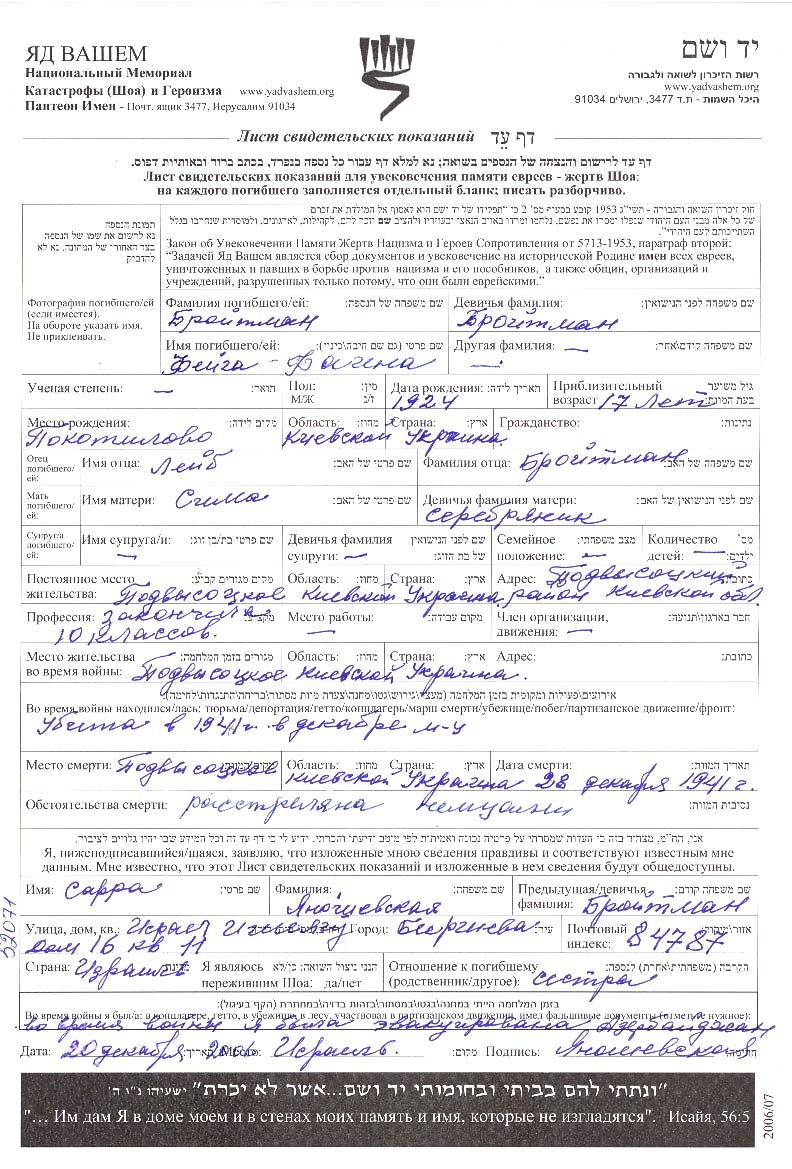 Feiga Faina Broitman was born in Pokotilovo, Ukraine (USSR), 1924. Prior to WWII she lived in Podvysokoye, Ukraine (USSR). Feiga Faina was murdered in the Shoah. Place of death: Podvysokoye, Ukraine (USSR), 28/12/1941.