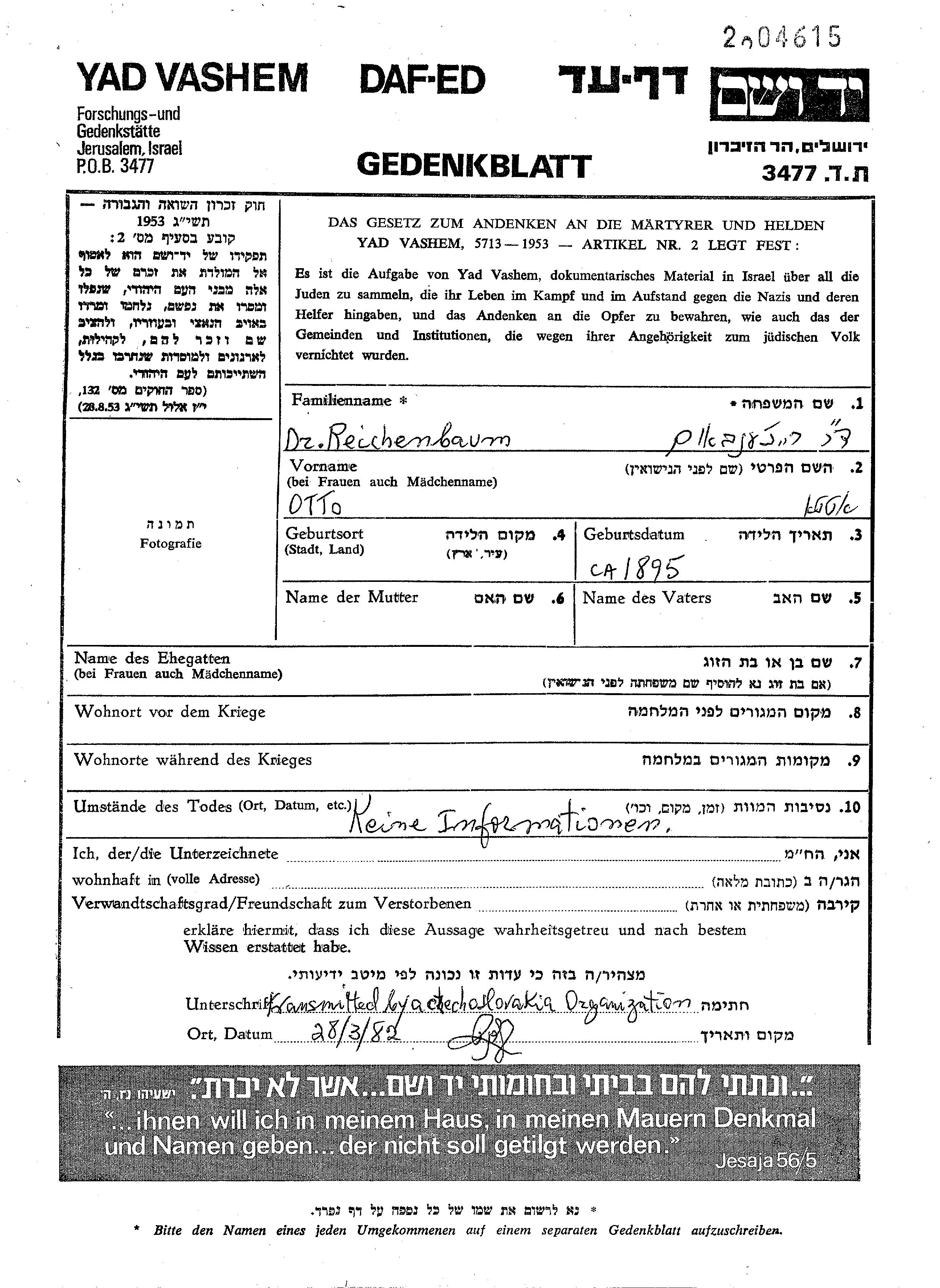 Reichenbaum Otto 1895 unstated place, Page of Testimony