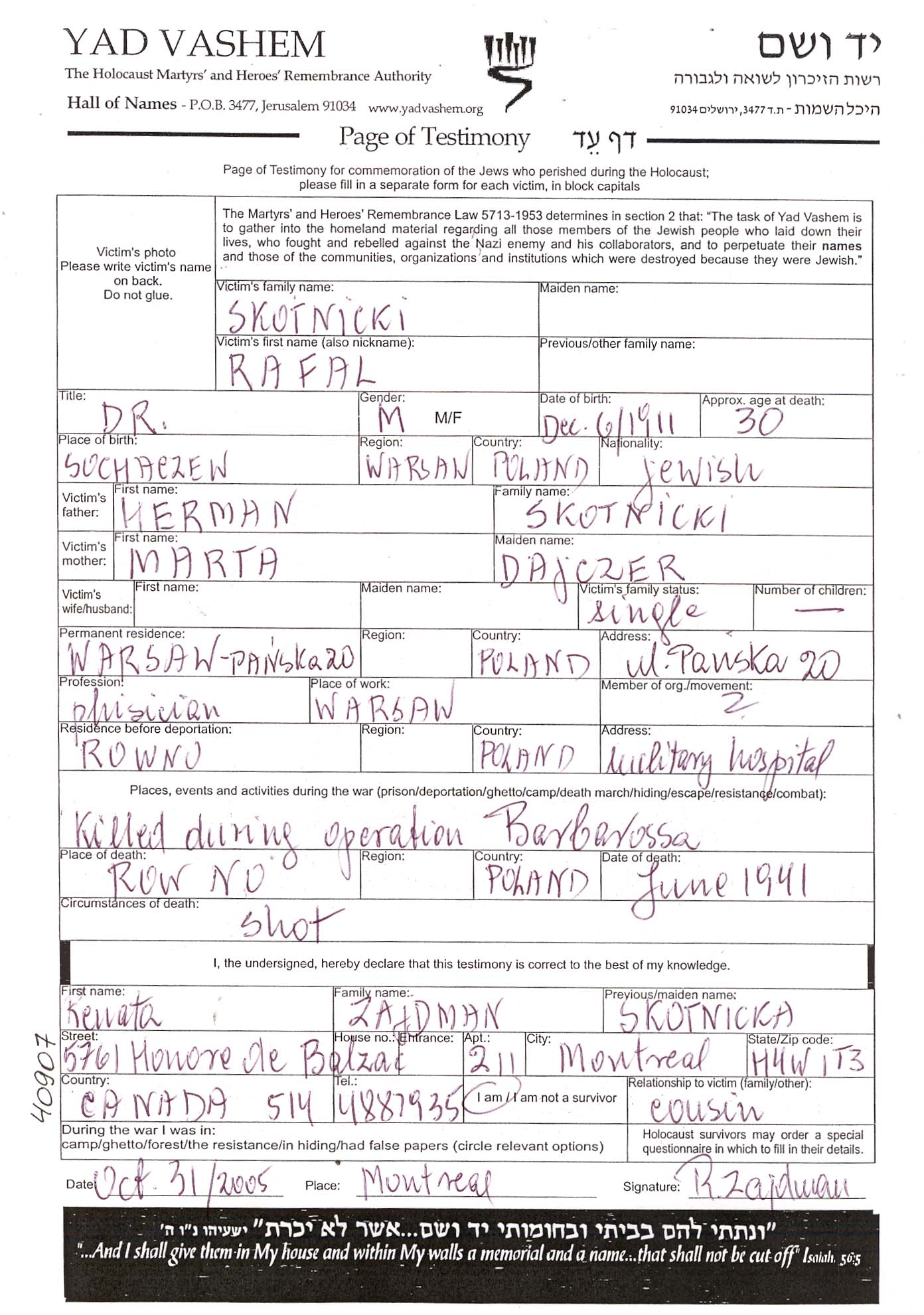 Rafael Skotnicki was born in Warszawa, Poland. He was a physician. Prior to WWII he lived in Warszawa, Poland. Rafael was murdered in the Shoah. Place of death: Rowno, Poland, 06/1941.