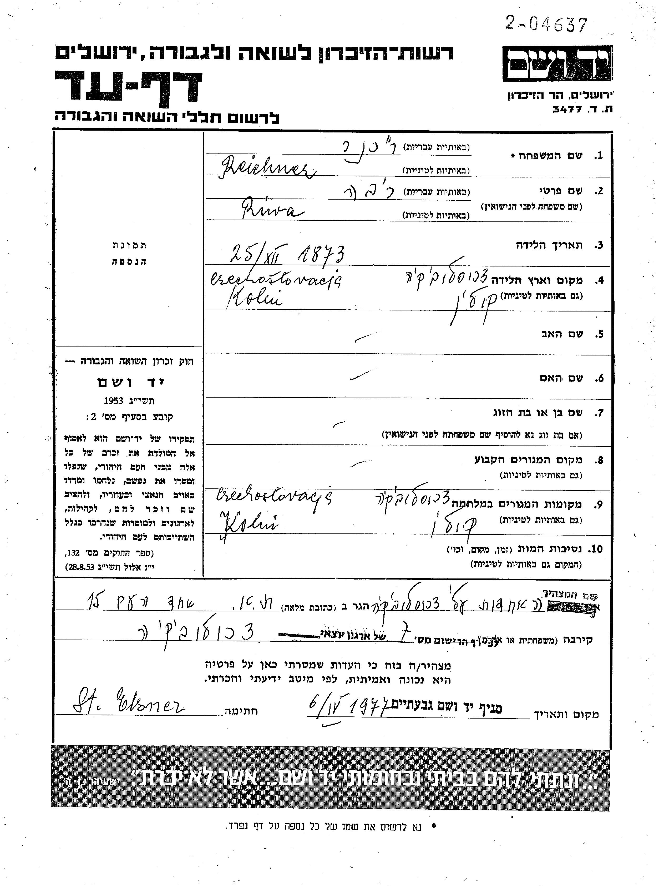 Reichner Riva 1873 Kolin, Czechoslovakia Page of Testimony