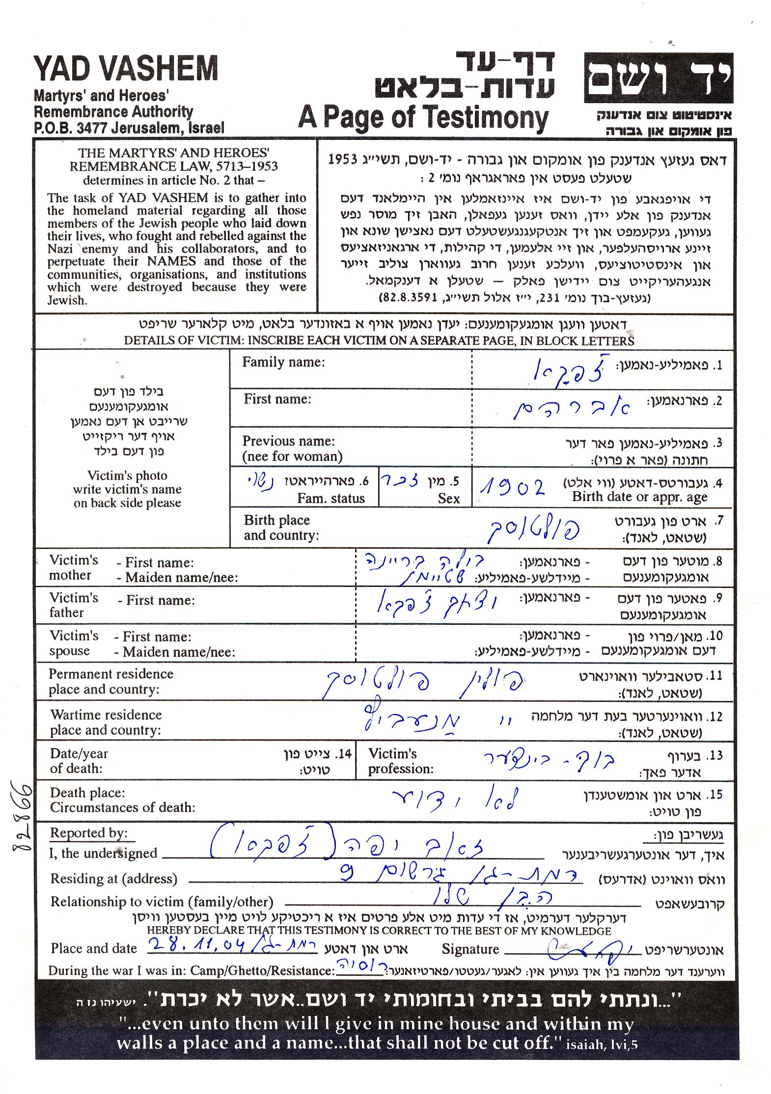 Zhepka Avraham 1902 Pultusk, Poland Page of Testimony