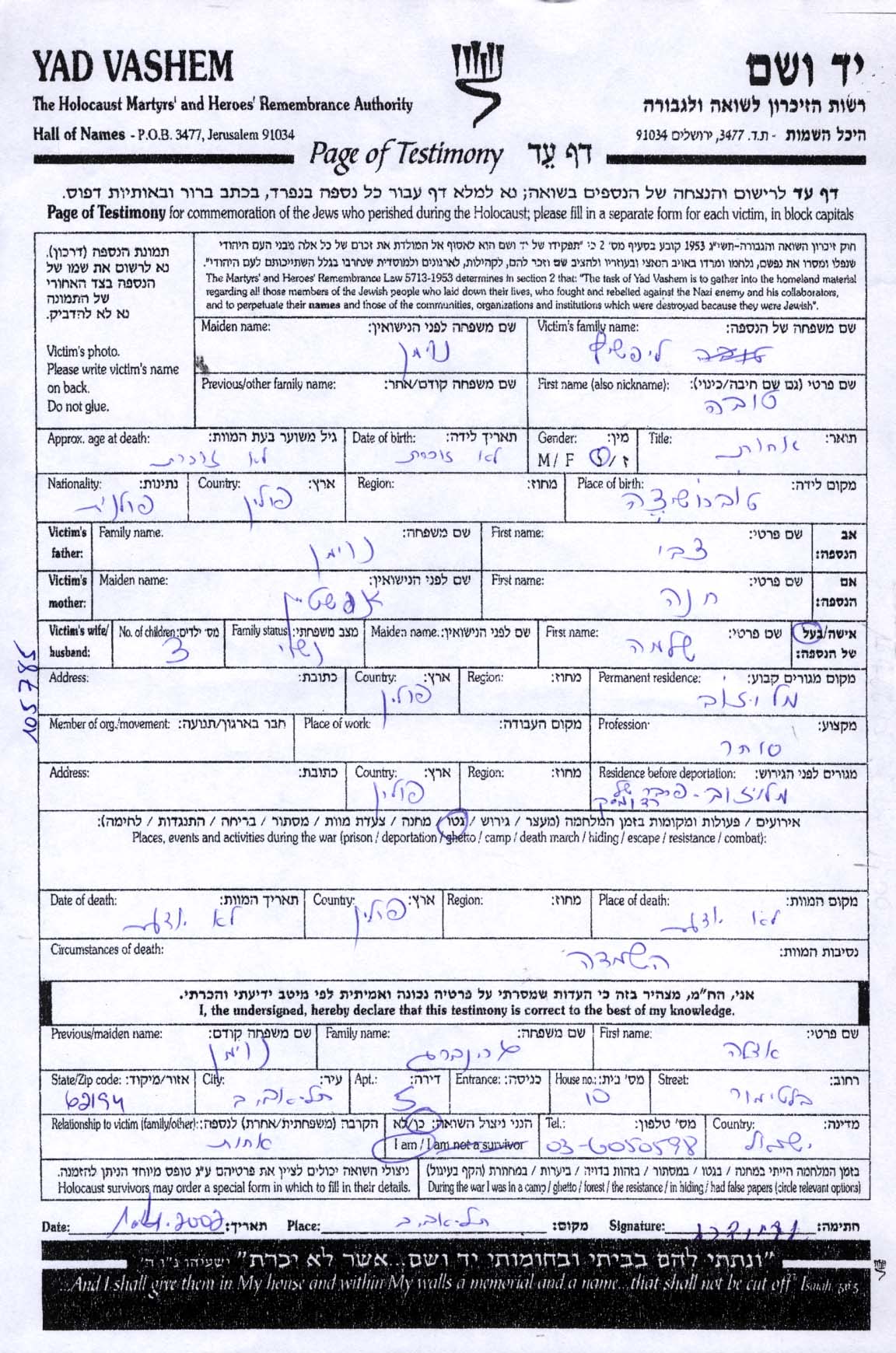 Tova Lipschitz nee Neiman was born in Dobryszyce, Poland, 1900. She was a housewife. Prior to WWII she lived in Radomsko, Poland. Tova was murdered in the Shoah. Place of death: unstated place.