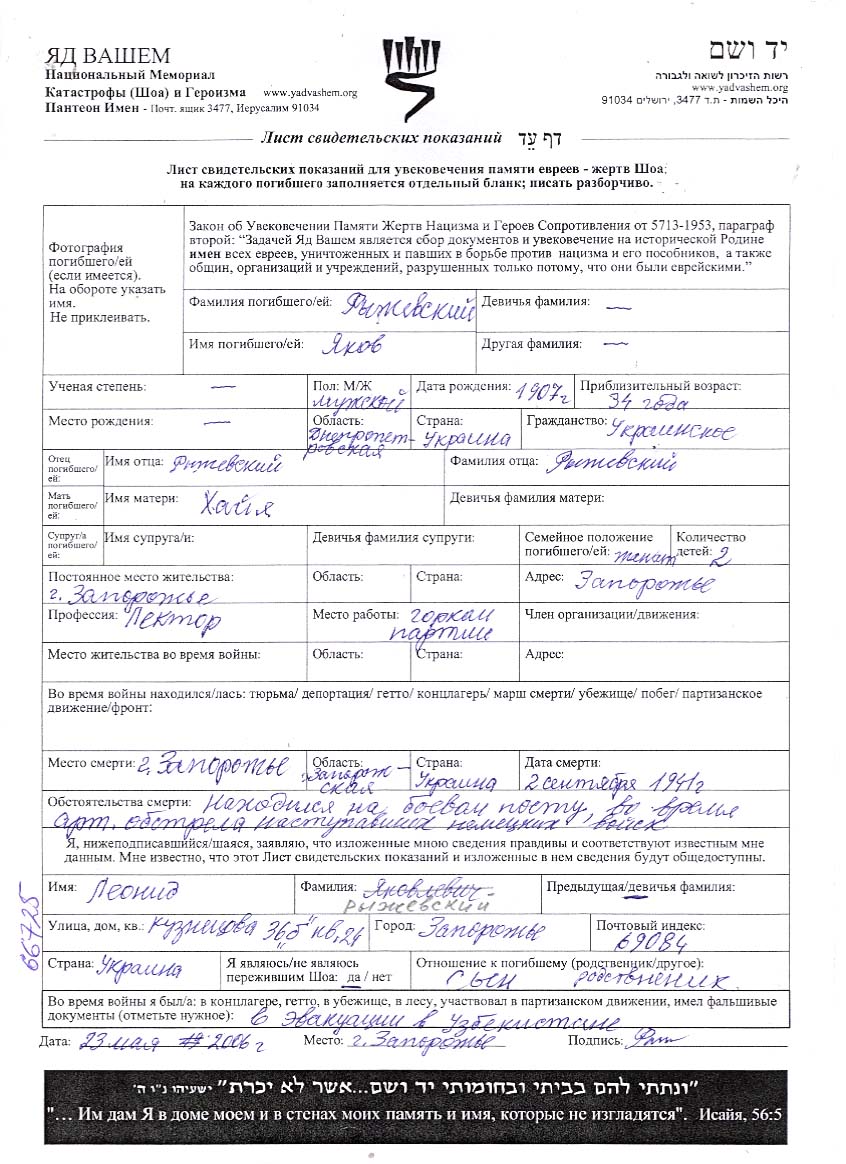 | Ryzhevski | Yakov | 1907 | Zaporozhye, Ukraine (USSR) | Page of Testimony |