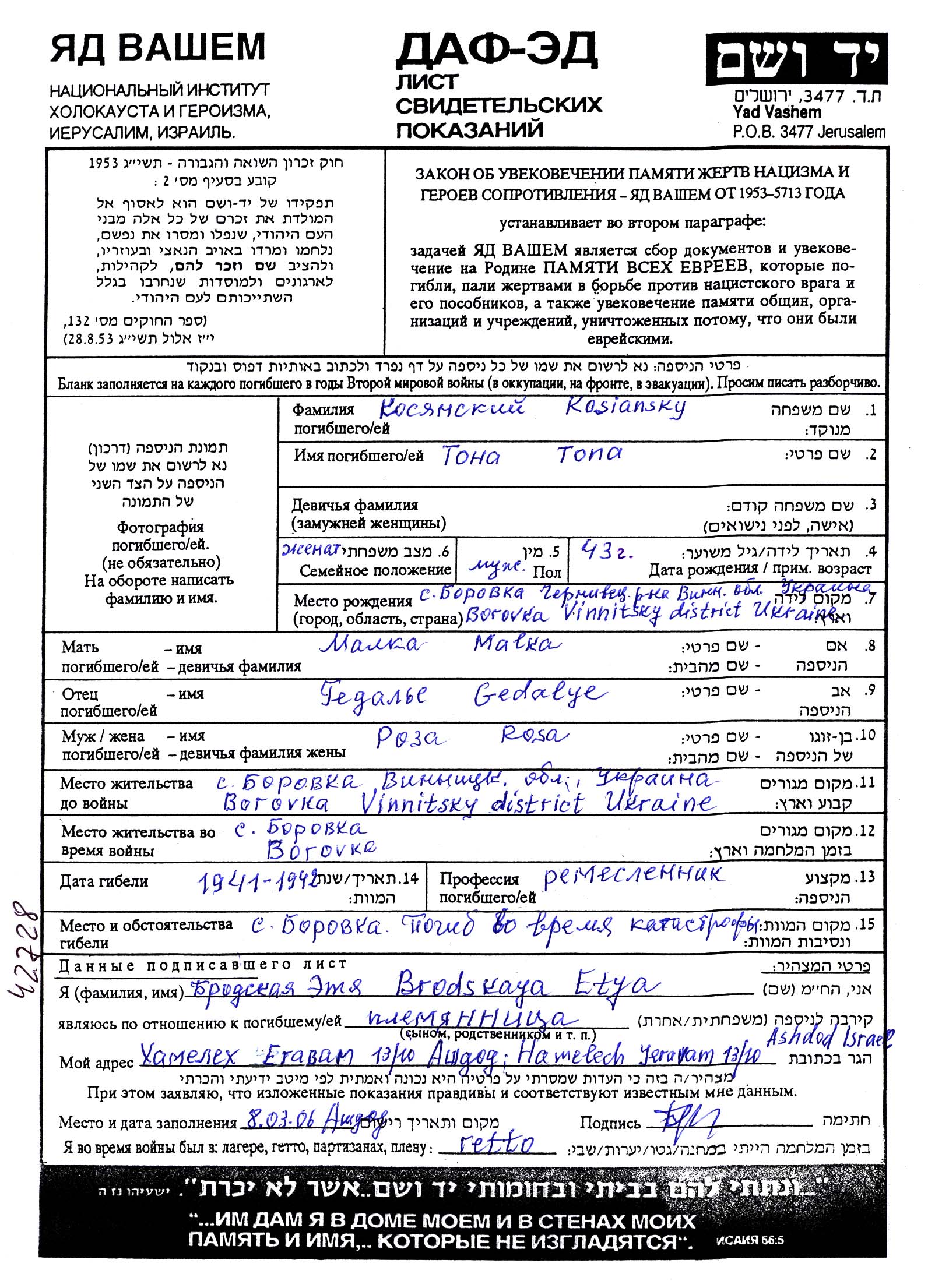 Tona Kosyanski was born in Borovka, Ukraine (USSR), 1892. She was a craftsman. Prior to WWII she lived in Borovka, Ukraine (USSR). Tona was murdered in the Shoah. Place of death: Borovka, Ukraine (USSR), 1941.