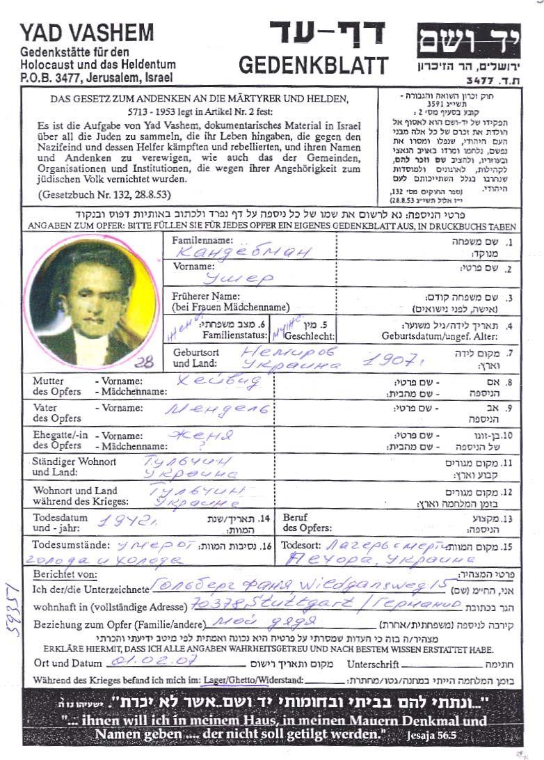 Kandyobman Usher 1907 Tulchin, Ukraine (USSR) Page of Testimony