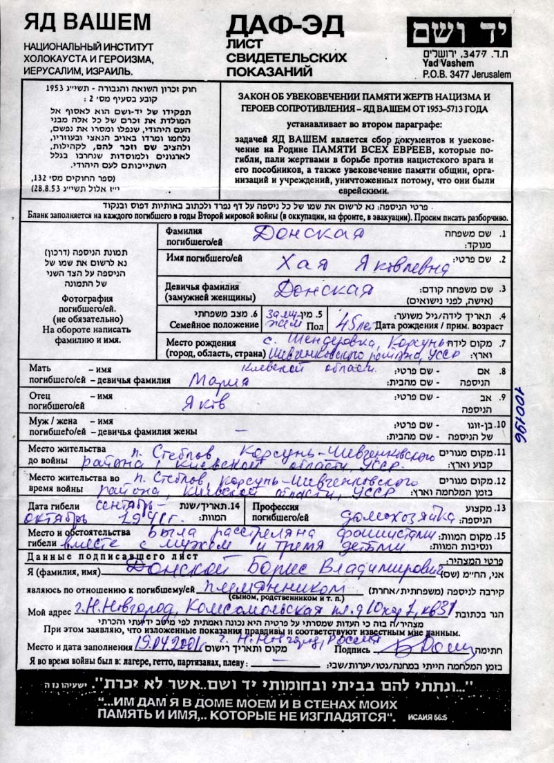 Khaia Derzhavina nee Donskoy was born in Shenderovka, Ukraine (USSR). She was a housewife. Prior to WWII she lived in Steblev, Ukraine (USSR). Khaia was murdered in the Shoah. Place of death: Steblev, Ukraine (USSR).