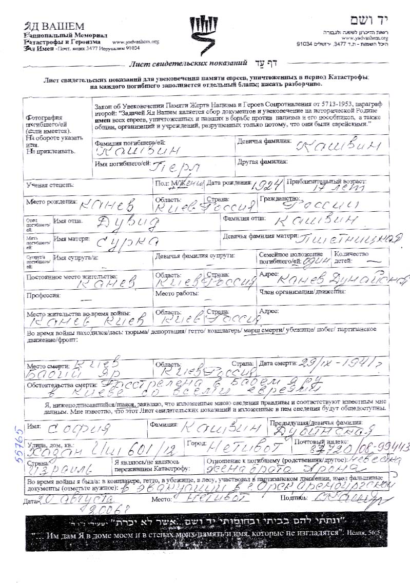 Perl Kashvin was born in Kanev, Ukraine (USSR), 1924. She was a pupil. Prior to WWII she lived in Kanev, Ukraine (USSR). Perl was murdered in the Shoah. Place of death: Babi Yar, Ukraine (USSR), 1941.