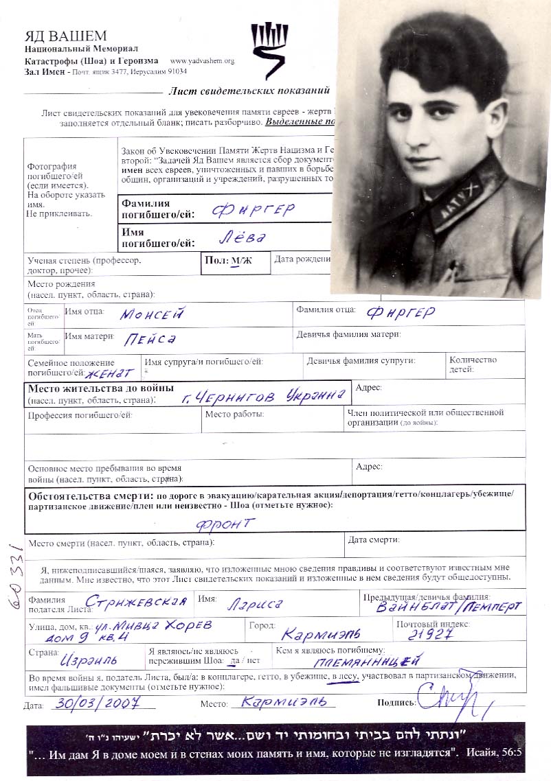 Firger | Lyova | Chernigov, Ukraine (USSR) | Page of Testimony | |