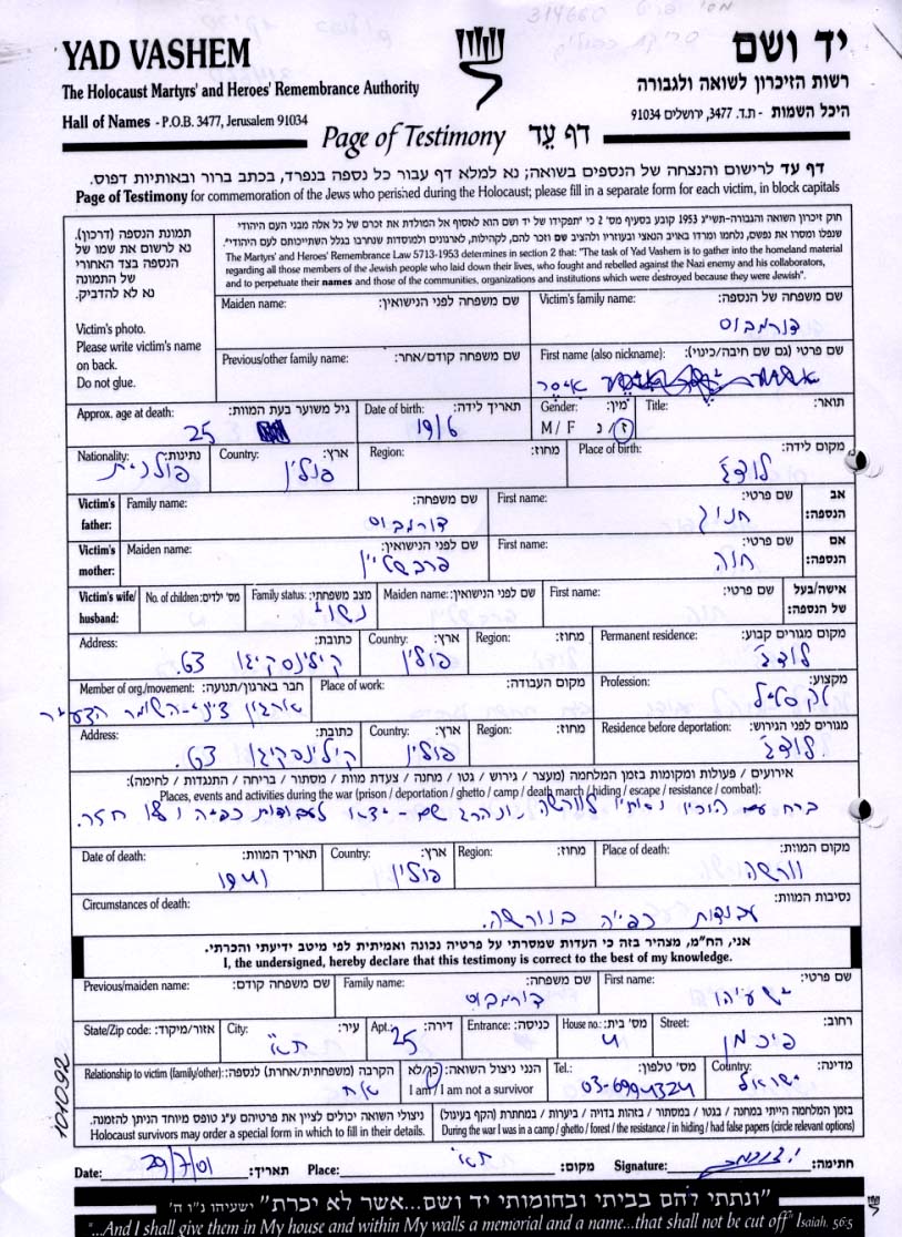 Yad Vashem - Pages of Testimony Names Memorial Collection