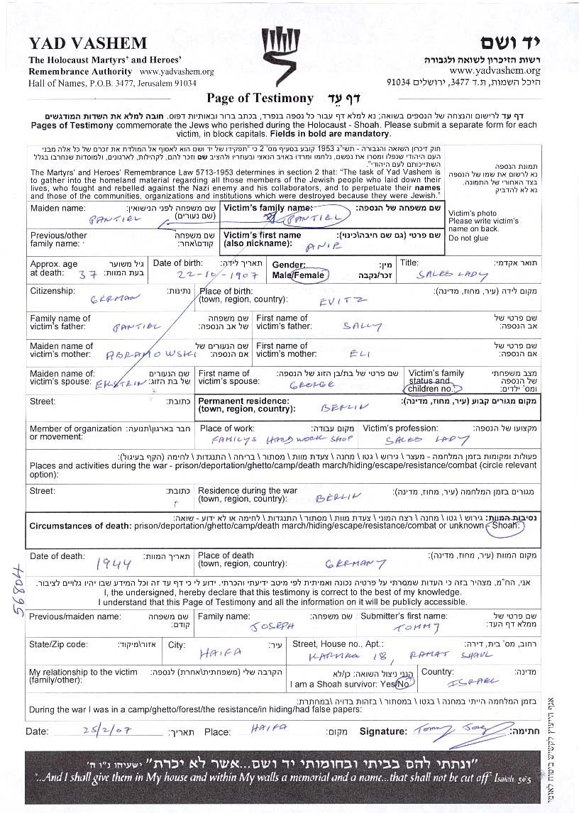 Ana Eckstein was born in Iwiec, Poland, 1907. She was a housewife. Prior to WWII she lived in Preussisch Friedland, Germany. Ana was murdered in the Shoah. Place of death: unstated place, 1944.