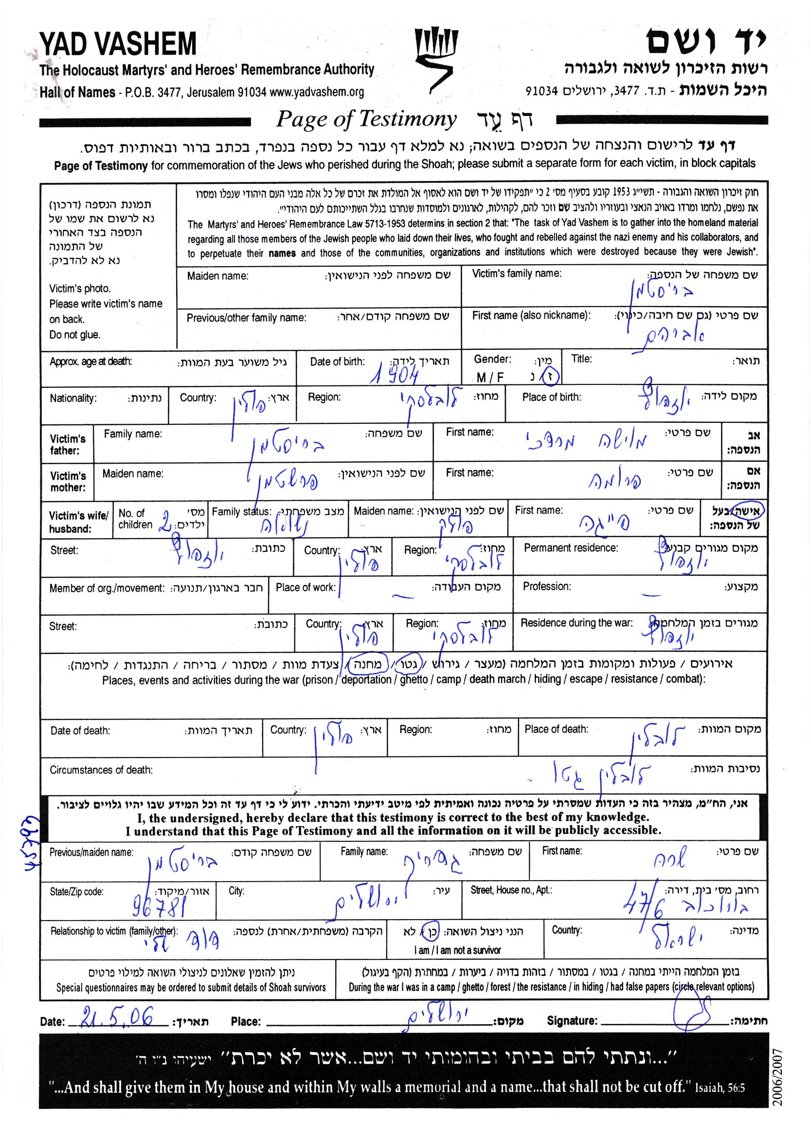 Yad Vashem - Pages of Testimony Names Memorial Collection