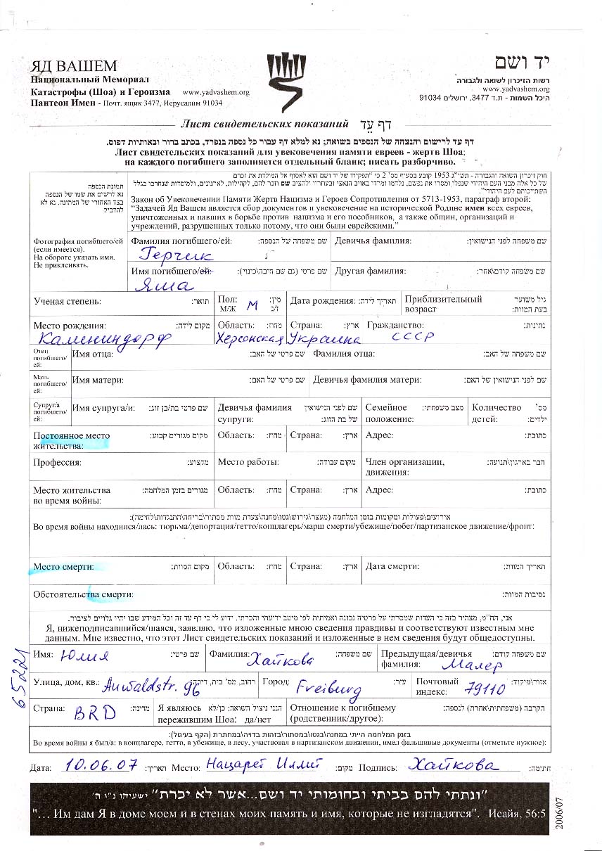 Gerchik | Yankel | 1886 | Kalinindorf, Ukraine (USSR) | Page of Testimony |