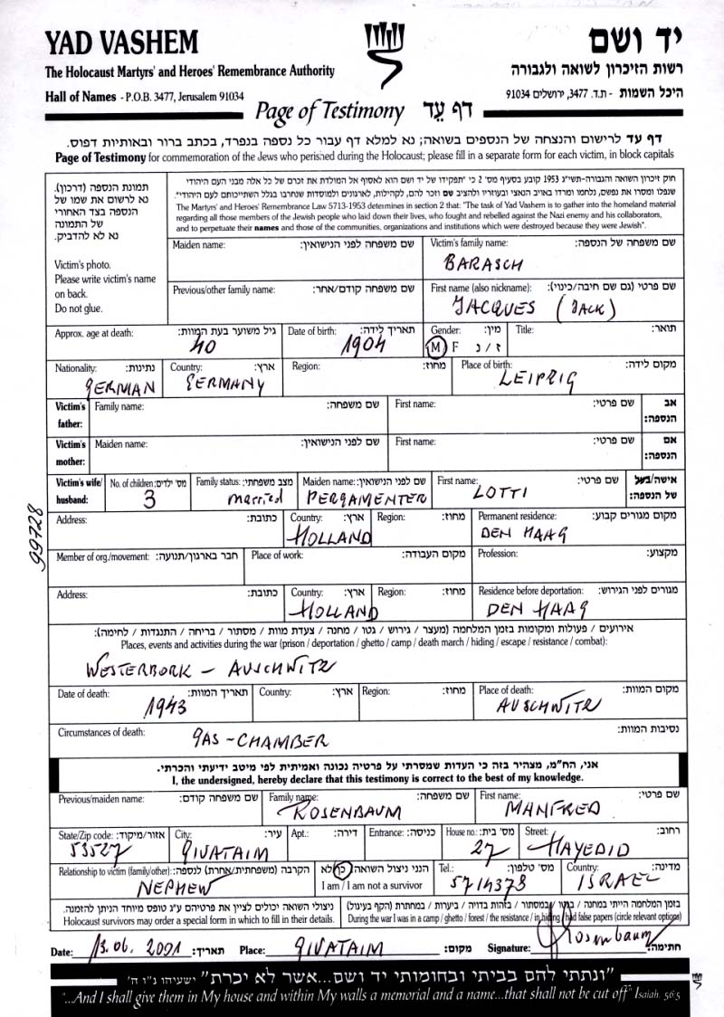 Jaques was murdered in the Shoah. Place of death: Auschwitz, Poland, 1943.