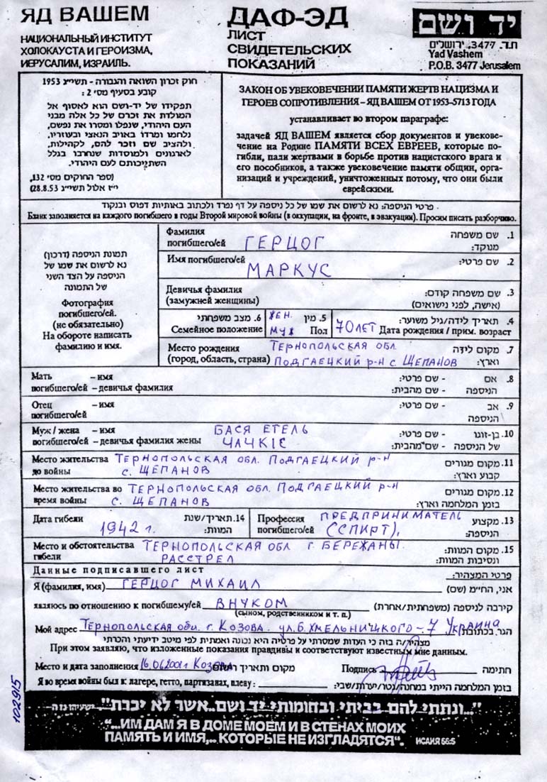 Herzog Mordekhai 1870 Tarnopol, Poland Page of Testimony