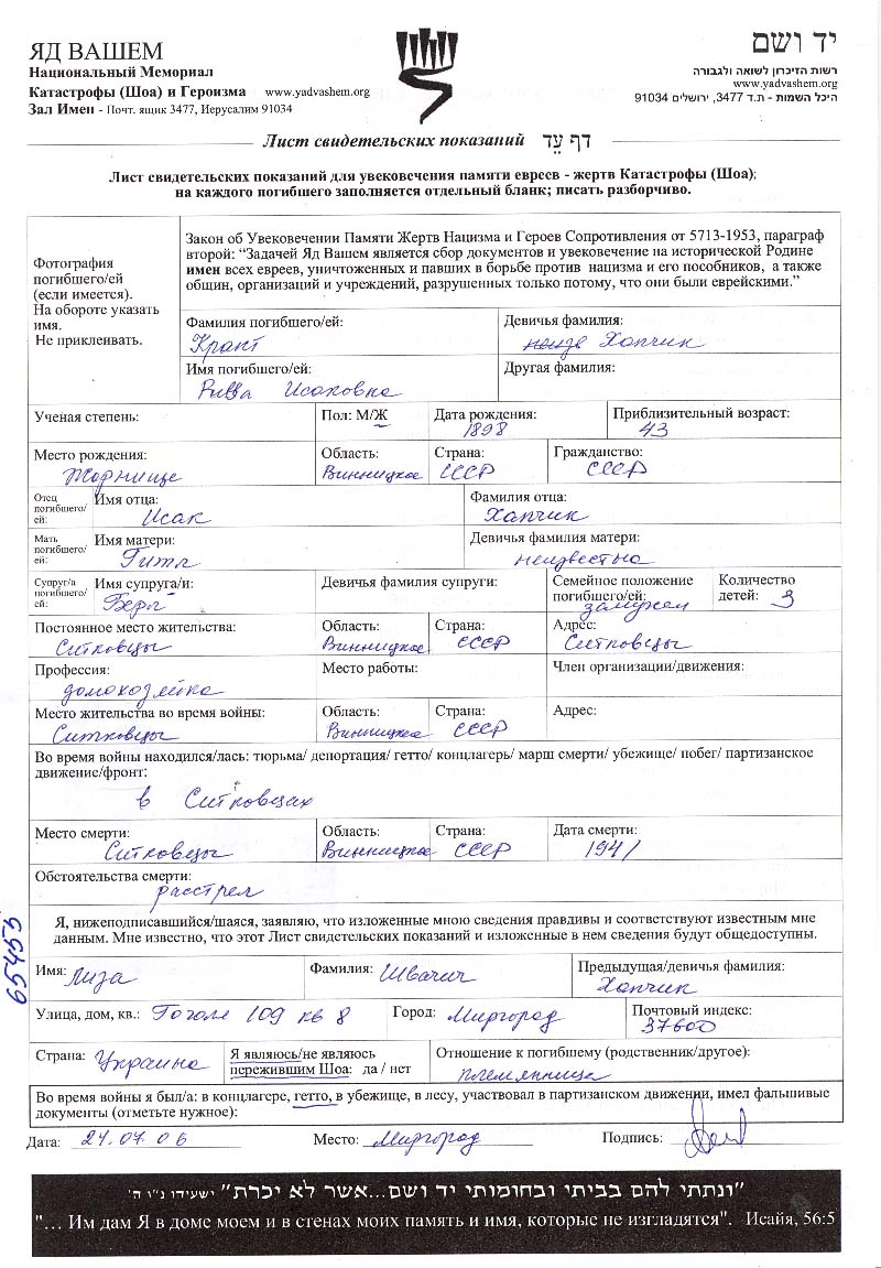 Riva Krant nee Khapchik was born in Zhornishche, Ukraine (USSR), 1886. She was a housewife. Prior to WWII she lived in Sitkovtsy, Ukraine (USSR). Riva was murdered in the Shoah. Place of death: Raygorod, Ukraine (USSR), 1942.