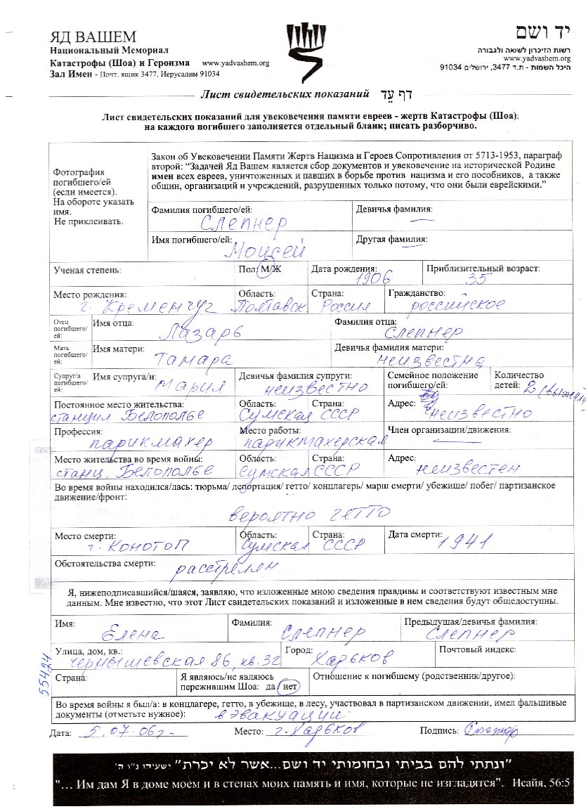 Moisei Slepner was born in Kremenchug, Ukraine (USSR), 1907. He was a hairdresser. Prior to WWII he lived in Belopolye, Ukraine (USSR). Moisei was murdered in the Shoah. Place of death: Belopolye, Ukraine (USSR), 1941.